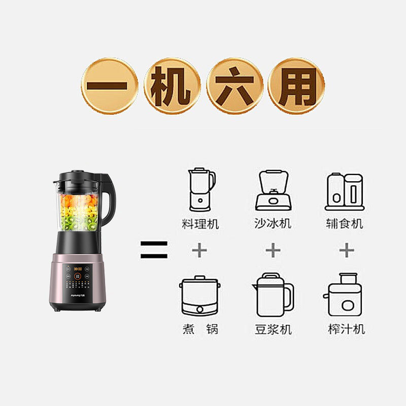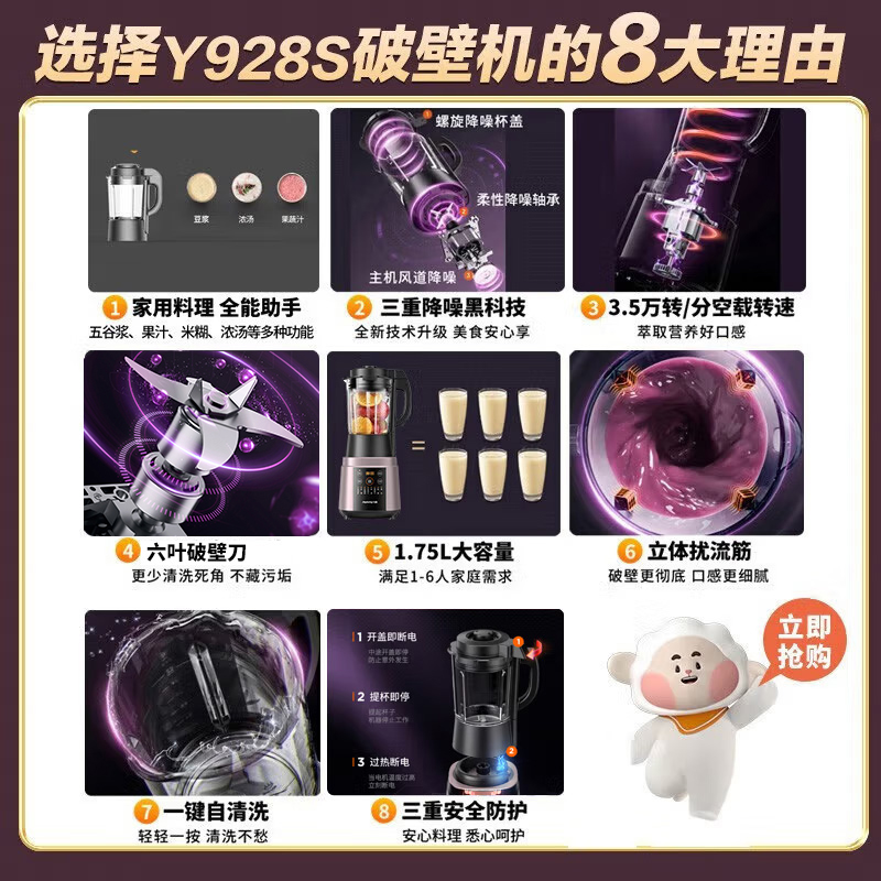 Joyoung 九阳 L18-Y928S 破壁料理机研磨功率为1500W,转速可达32000转/分钟,搭配4叶旋风刀头,支持一键环流加热,可对食材进行独立加热,支持4小时恒温保暖,倒梯形杯体,加热均匀不易糊底,内置7大烹饪模式,可一键制作,支持最大12小时预约功能,十分方便。