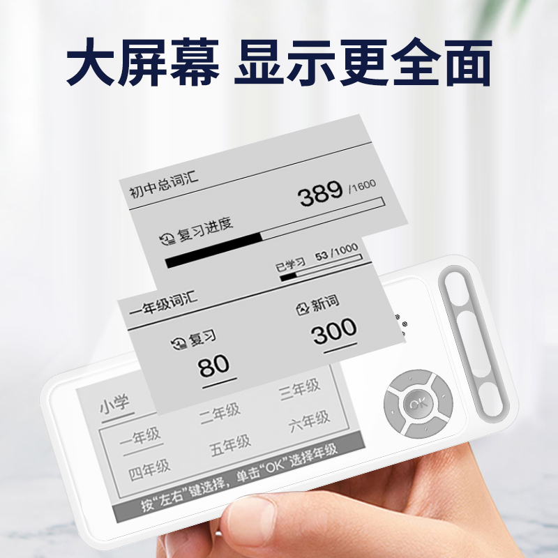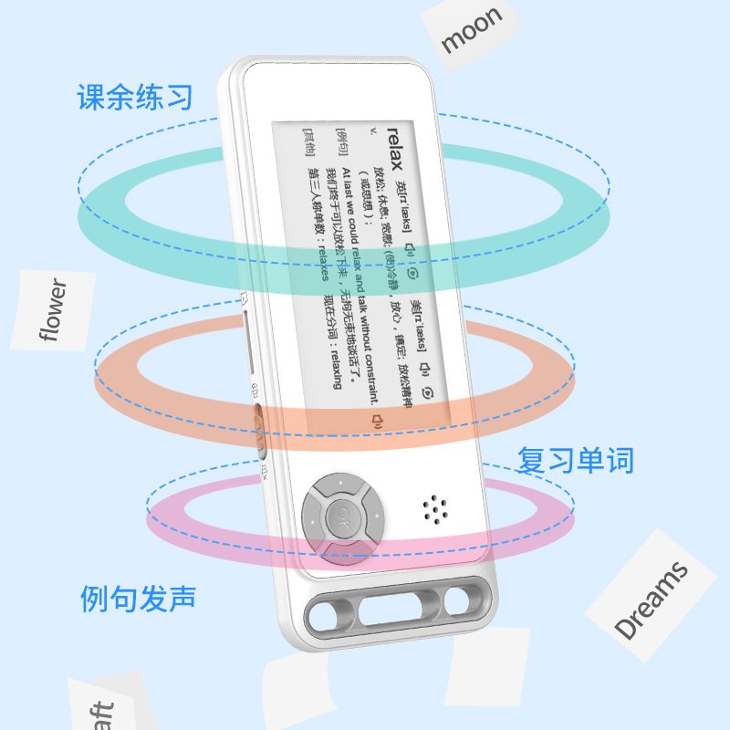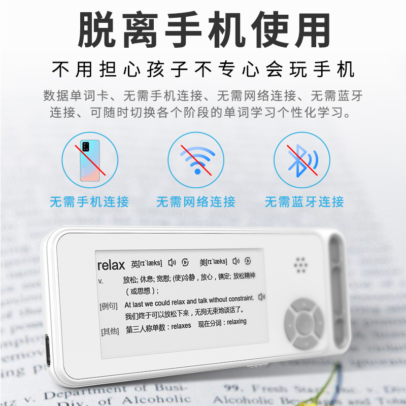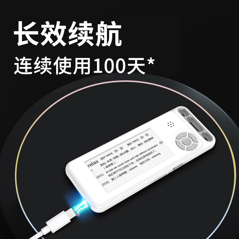 纯正英式真人单词发音,真人例句朗读,自由调节音量,学习英语单词就这么简单,采用电子墨水屏文字,限时堪比激光时刻印,阅读体验媲美纸质图书。全天显示,底色简洁干净,日常显示英语单词及释义,即拿即用。充电一次可待机100天,无需关闭设备、再次使用时,按任意键即可唤醒,即拿即用。