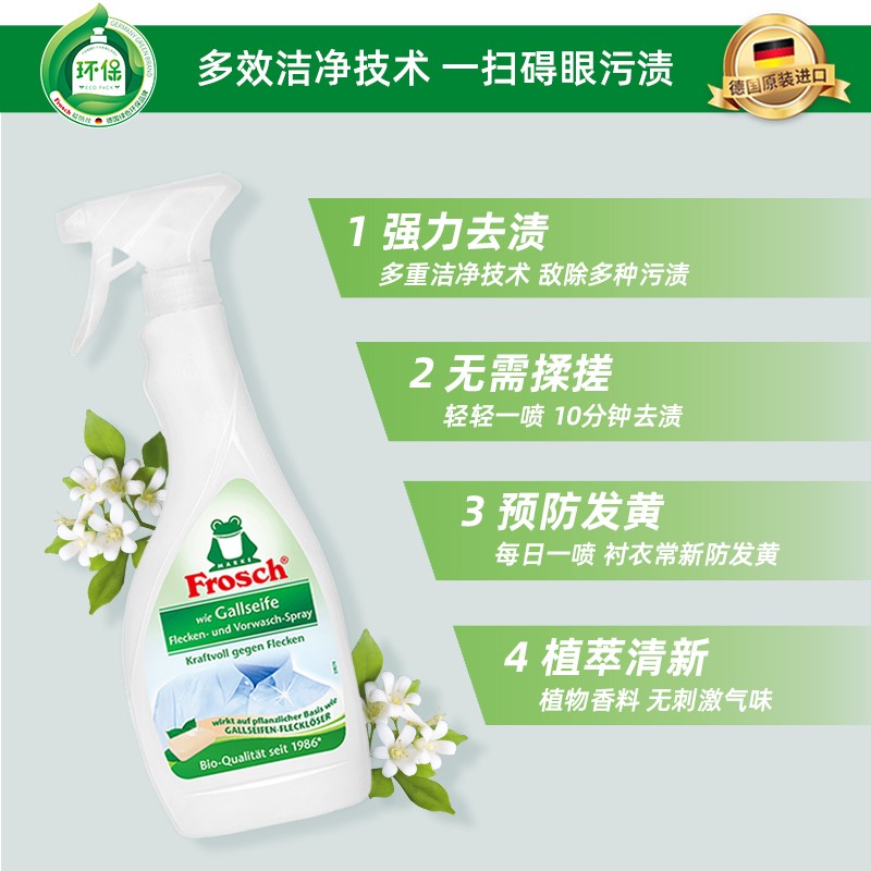 强力去渍,多重洁净技术敌除多种污渍,无需揉搓,轻轻一喷10分钟去渍,预防发黄,每日一喷,衬衣常新防发黄,植萃清新,植物香料无刺激气味。