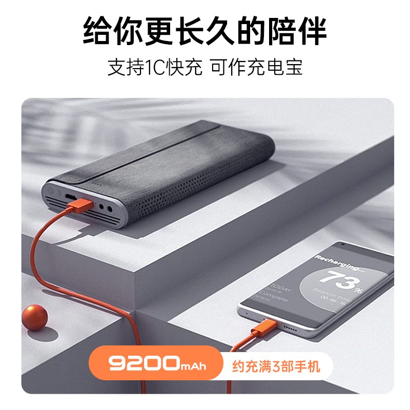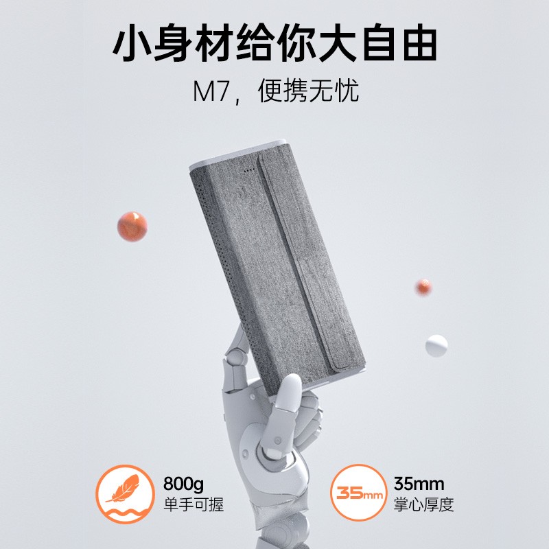 坚果终于将旗下M系列更新了,11月初,坚果发布了M系列的新机型-坚果 M7便携投影仪。这是一款主打便携快充的投影仪。227*99*35mm的机身尺寸小巧便携,搭载9200mAh电池,带来了长达2.5小时的超长续航;同时配备60W高功率适配器,1小时即可充80%的电量。此外还支持反向充电,随时变身”M7充电宝“。
