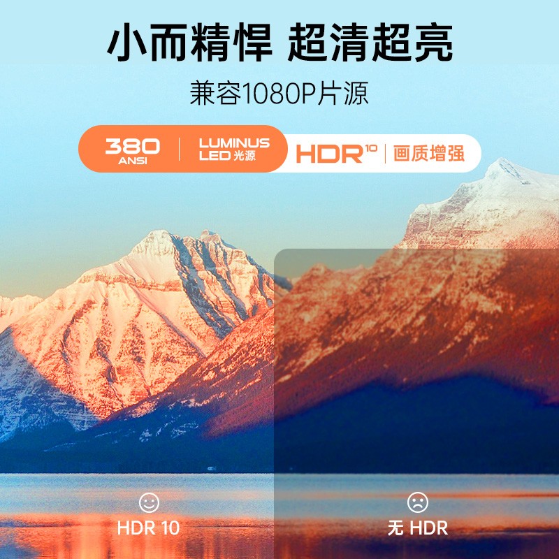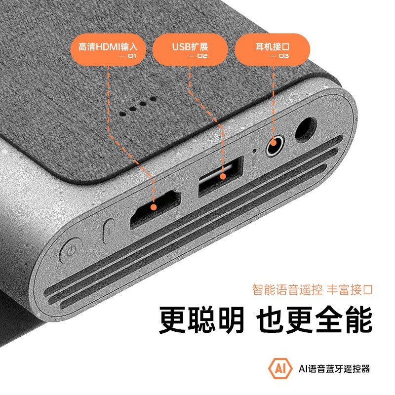 硬件配置方面,960*540dpi标准分辨率,最大兼容1920*1080dpi分辨率,真实380ANSI流明亮度,且支持HDR10画质增强。支持上下左右梯形矫正,配合自带大角度支架,可轻松调整画面方位。采用TOF激光对焦技术,一秒内,实现自动对焦。1.2:1投射比,2.60米即可投射出百寸大屏。内置独立大腔体,全频大喇叭,HI-FI芯片,做到了小体积,好声音。同时搭载了智能语音控制系统,想看啥片,一句话的事儿。