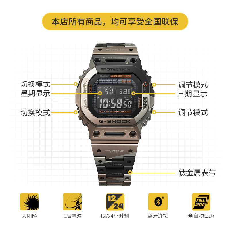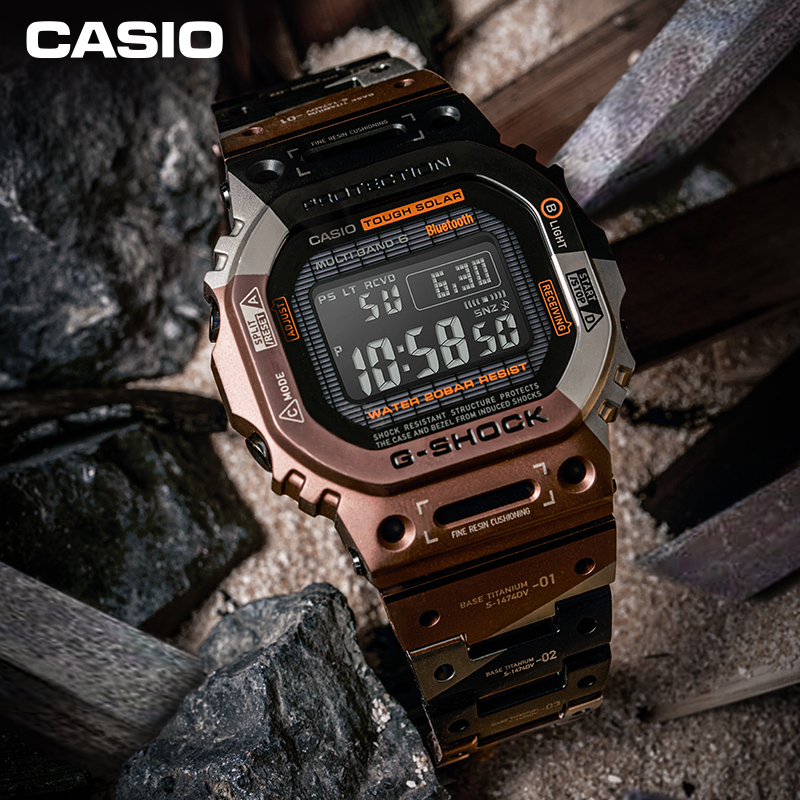 CASIO 卡西欧 G-SHOCK系列 全金属机甲款 男士石英表 GMW-B5000TVB-1PR,此款延续「G」甲战士第一弹未来主义的设计风格,复刻“虚拟世界的战士”灵感,第二弹MWB5000VB:1超越进化想象,刷新腕间爆表战力,沿袭经典方形设计,塑造全“钛”潮流趋势,表款整体采用钛金属材质打造,集耐腐蚀、耐磨、高稳定性及低致敏性等优势于一体,轻量与强护兼具,外观使用特殊着色工艺,整体覆盖银色TIC涂层,自带未来感特质,表圈和表带部分依次用,褐色以及黑色IP涂层,逐步上色层次分明,为表款加持高端科技BUFF,表身多处采用激光雕刻,以机甲特质文字标记外甲,铸就重型潮流武装机体,设有多处开孔设计,旨在注入未来风格,韧劲十足更抗造,全金属抗冲击构造,表圈与表壳之间装入精细树脂,有效缓解外力冲击造成的损害,旋入式密封表背,旋入式表背紧密密封,表背采用DLC涂层增强耐磨程度,通过连接专属软件,G-SHOCK Connected,实现时间的智能记录及管理功能。