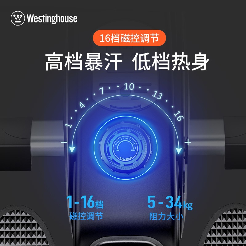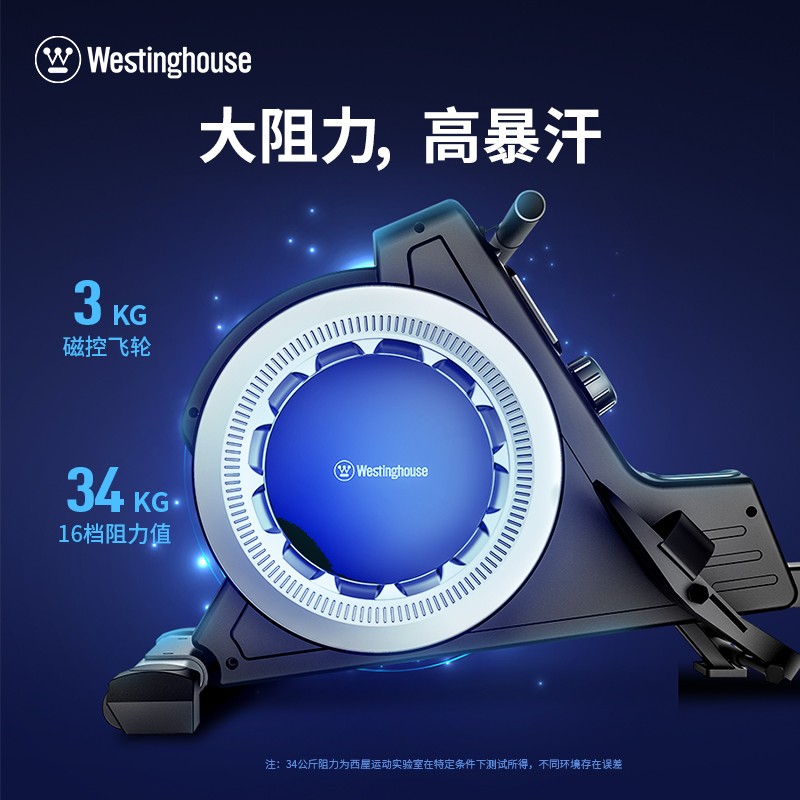 34公斤阻力≈2个桶装水,短时间快速暴汗16档阻力调节,适用家庭成员不同阻力需求,采用新一代磁控静音3kg飞轮,做工扎实,用力更均匀,健身塑形效率更高,磁控真静音居家运动不扰邻,可折叠,竖立收纳随意摆放,小空间可自由收纳。