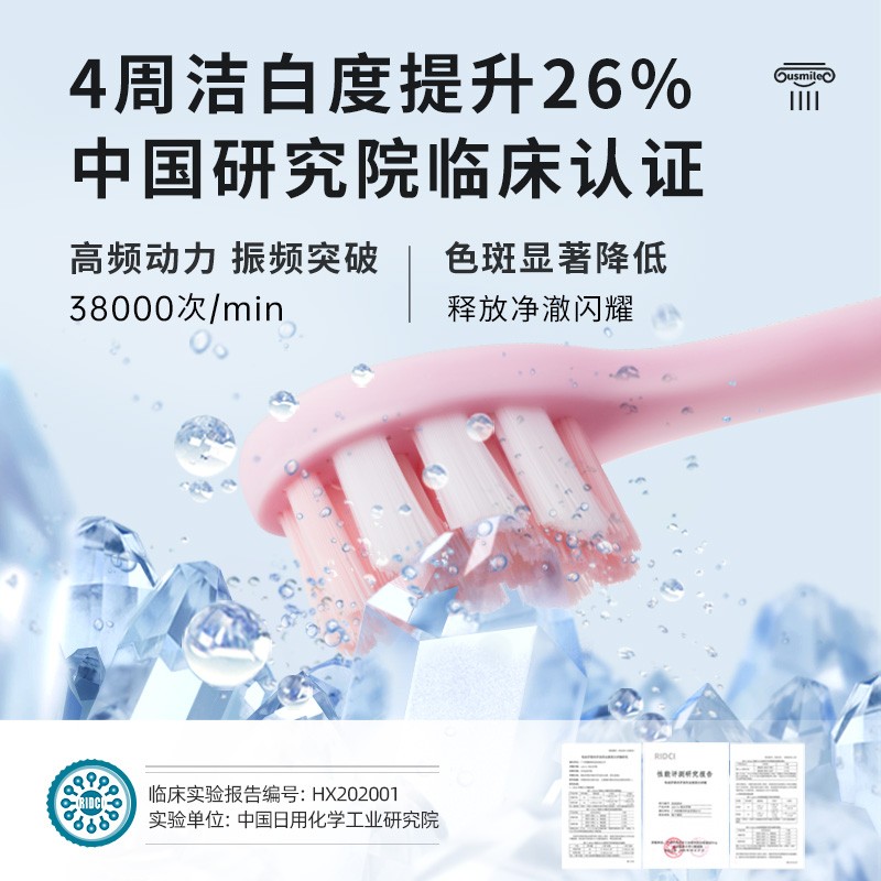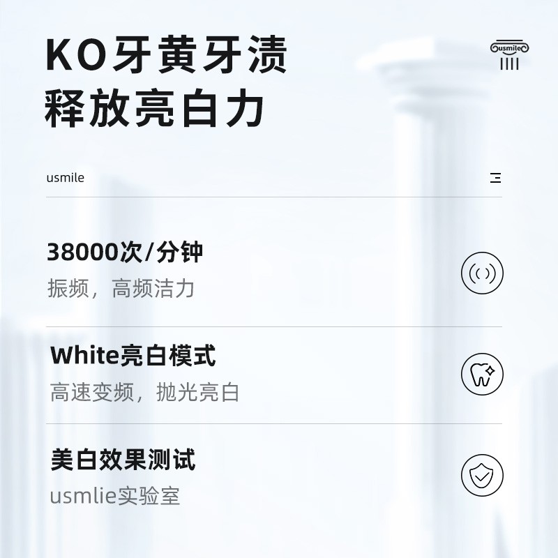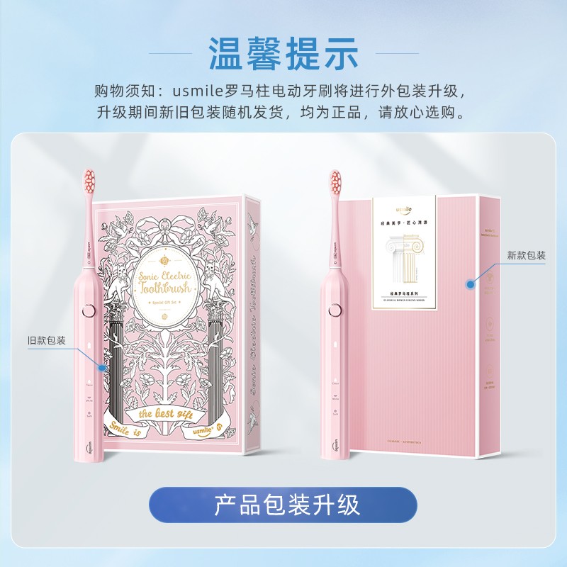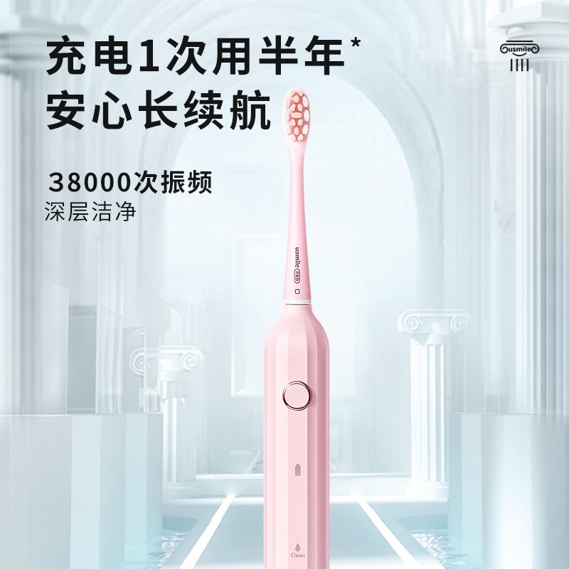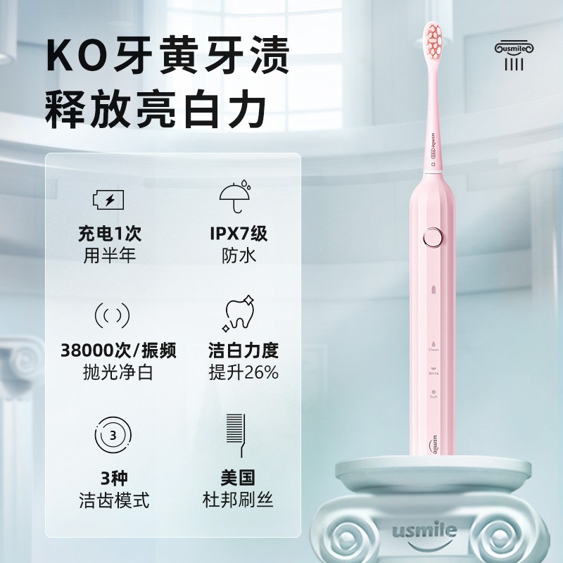 这款usmile Y1电动牙刷,曾荣获中国台湾金点设计奖,声波振动频率为38000次/min,IPX7全身防水,压力感应设计,智能护牙。共3种刷牙模式,包括:30秒换区刷牙提醒,2分钟停止刷牙提醒以及6分钟自动关机,支持定时提醒。配件包括usmile Y1声波电动牙刷手柄一支、Pro系列专用刷头专业款、呵护款各一个、适配器一个,USB充电线一条,使用说明书。官方说一年只用充电两次即可。