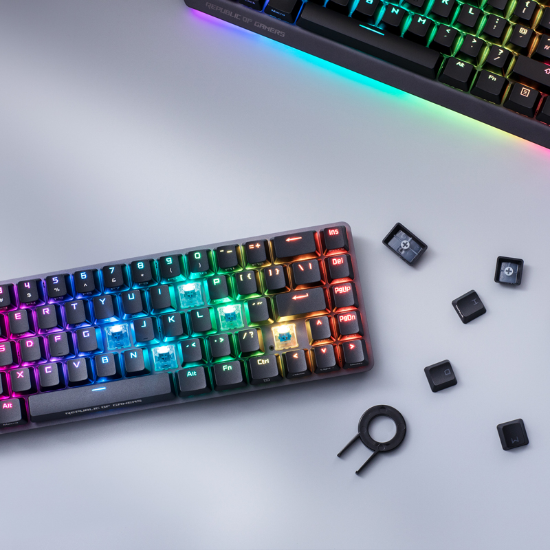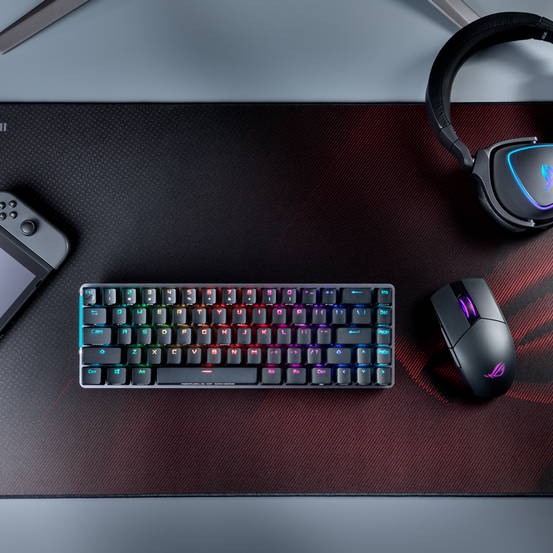 轴体为ROG NX 冰川蓝轴,配列方面为68键(65%配列),更紧凑布局。创新Smart Bar触控条拥有多项使用的功能,也是一个电量指示器,实时显示电池状态。连接方面支持无线双模连接。续航方面内置4000mAh电池,提供400H续航。透明键盘外壳,日常放置时可防尘。键帽为PBT双色注塑键帽,长时间使用不打油。支持Aura Sync神光同步。