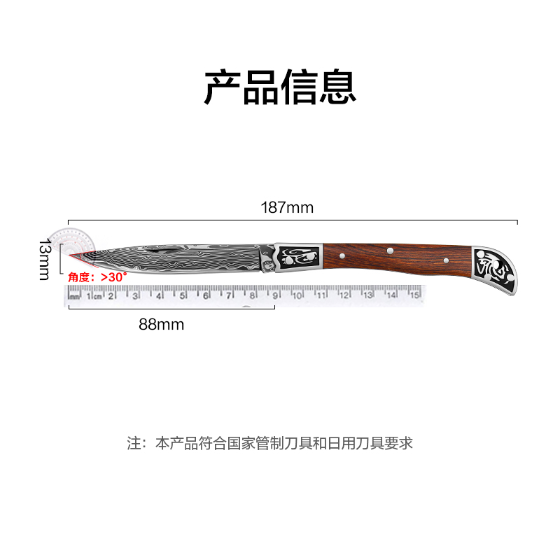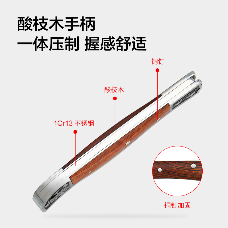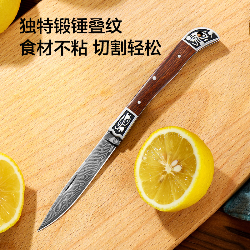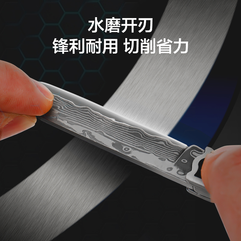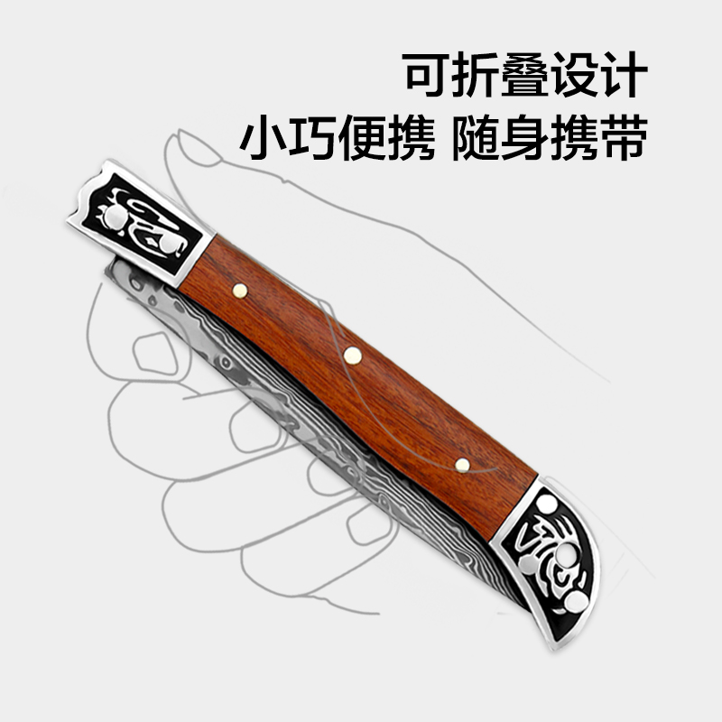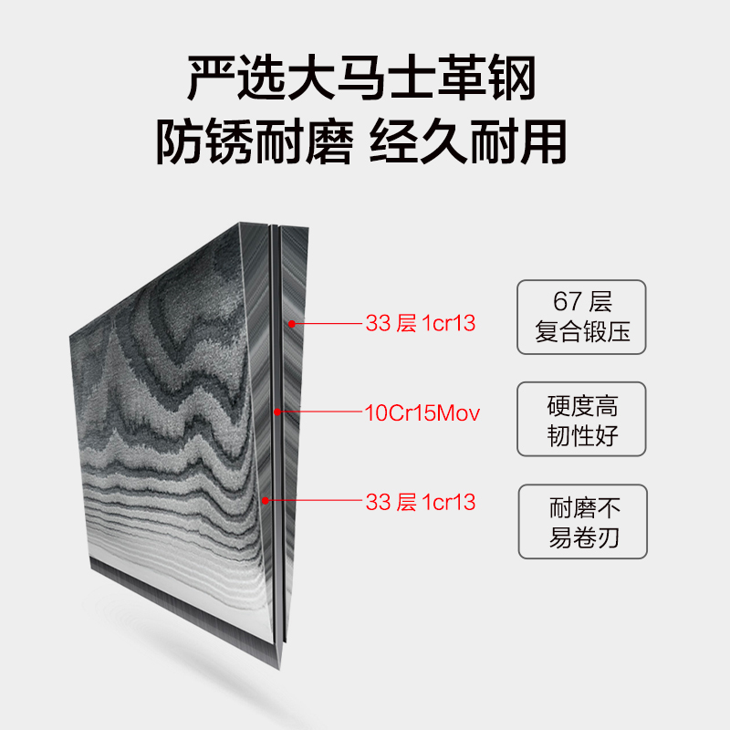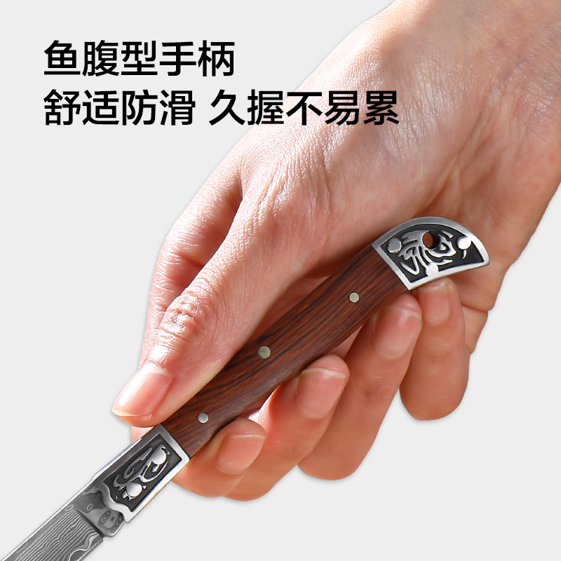 优选10Cr15MOV钢芯,经67层复合锻造而成,刀身坚韧加倍,刀刀更锋利,耐磨抗腐蚀,刀身采用酸洗工艺,三重复合压制,铜钉加固,牢固不脱落,握感舒适。鱼腹型手柄设计,手柄贴合手型,握感细腻舒适,可折叠设计,小巧便携。