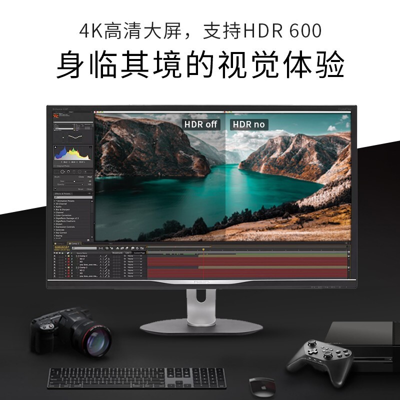 这款328P6VUBREB设计相对低调,边框较窄,配有支持多向调节支架,允许18cm升降、-5°/20°俯仰角度调节,可垂直、水平90°旋转,也支持VESA 100mm挂壁安装。规格方面,基于31.5英寸真10bit VA面板(3H硬化、防眩光),16:9长宽比,提供3840 x 2160分辨率,3000:1静态对比度,4ms灰阶响应和600 cd/m2 峰值亮度。主打色彩表现,具备Ultra Wide-Color超宽广色域技术,支持12bit(真10bit)色位输出,可呈现10.74亿色显,拥有NTSC 116%、sRGD 138%色域覆盖表现,出厂校准色差DeltaE<2,还通过VESA(影片电子标准协会)DisplayHDR 600认证,带来精准无偏差色彩表现。