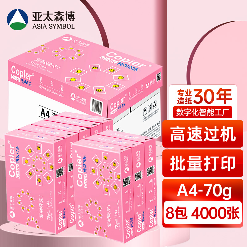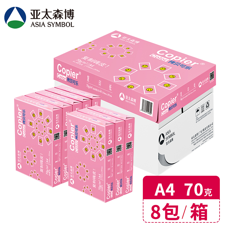 Asiasymbol 亚太森博是内地知名纸品生产厂商,主营各类办公用纸。这款A4复印纸,采用100%纯木浆纤维原料,纸面光滑洁白,可双面使用,适用于普通喷墨、激光打印、高速复印、传真等工作场合。规格70g,500张/包,共8包。