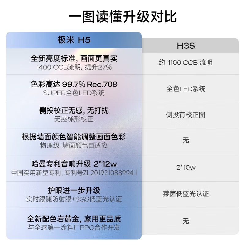 哈曼&极米联合定制,大振幅双扬声器&大口径振膜,更有双音效加持,高音清亮,低音浑厚,带来震撼听觉享受;H5搭载MTK旗舰级AI芯片搭配4G超大运存,让全新算法和功能的发挥游刃有余;H5选用更环保的LED光源,寿命可达到平均30000小时,每天看8小时,可以看10年。