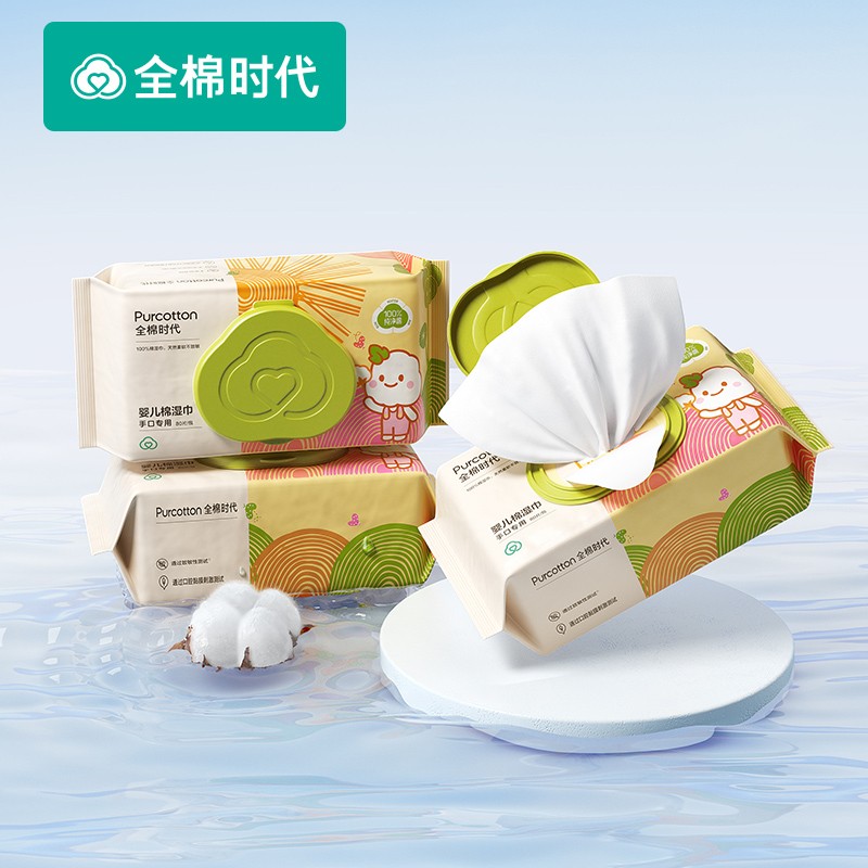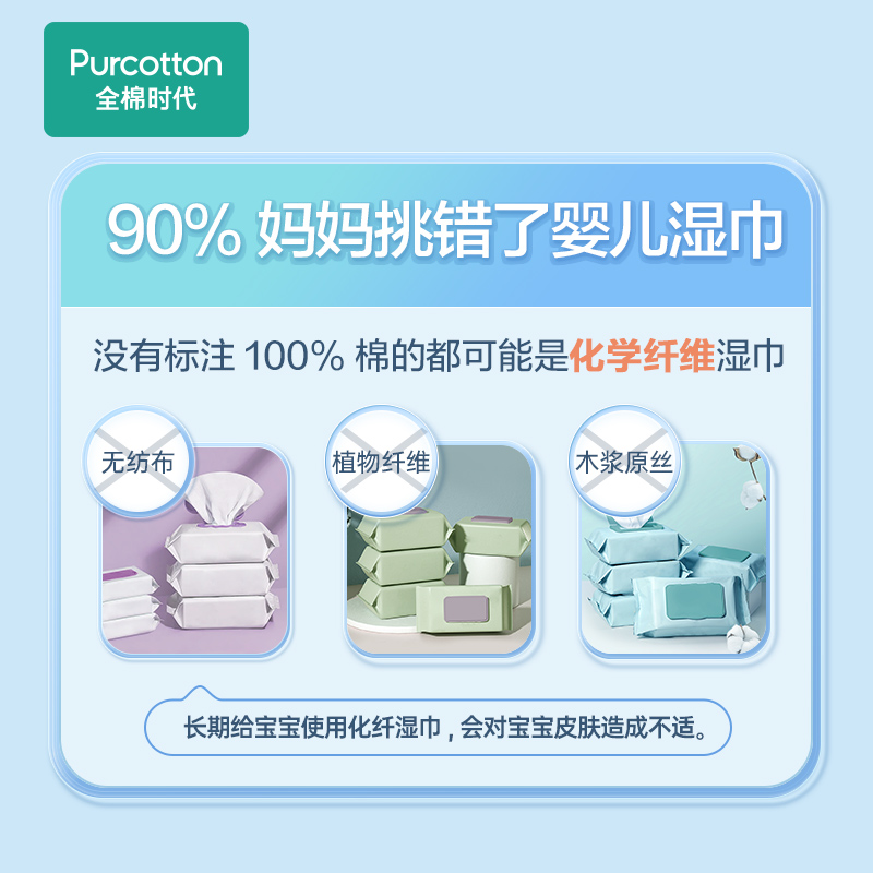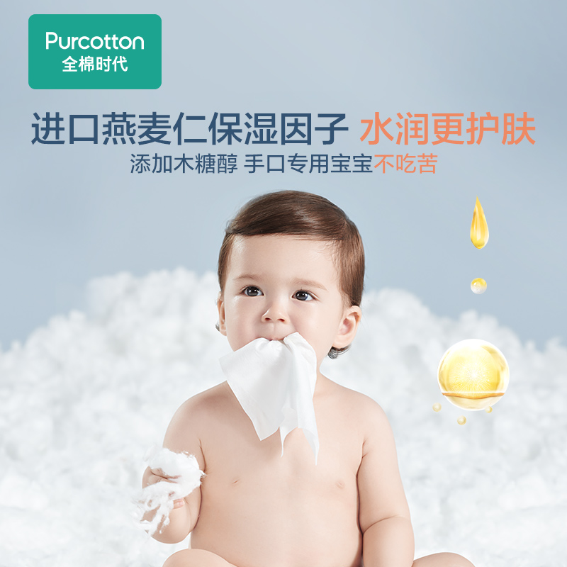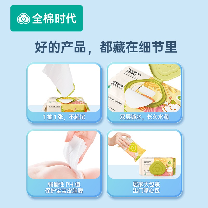 PurCotton全棉时代,取自Pure+Cotton的单词组合,意为用天然棉花生产出健康、亲肤、高品质的生活护理用品。商品采用100%进口美棉,天然无刺激,细致柔软不过敏。这款 婴儿湿巾水分丰富,特添加婴儿润肤成分。翻盖设计单手即可轻松开合,避免外界污染,减少湿巾水分蒸发,单片不粘连,抽取不连张。