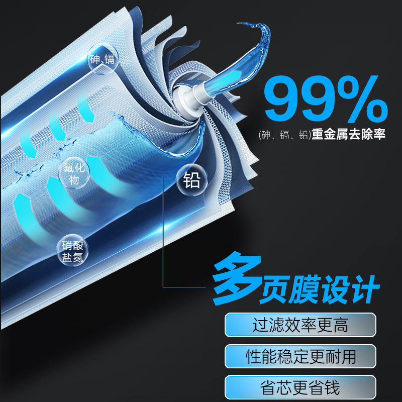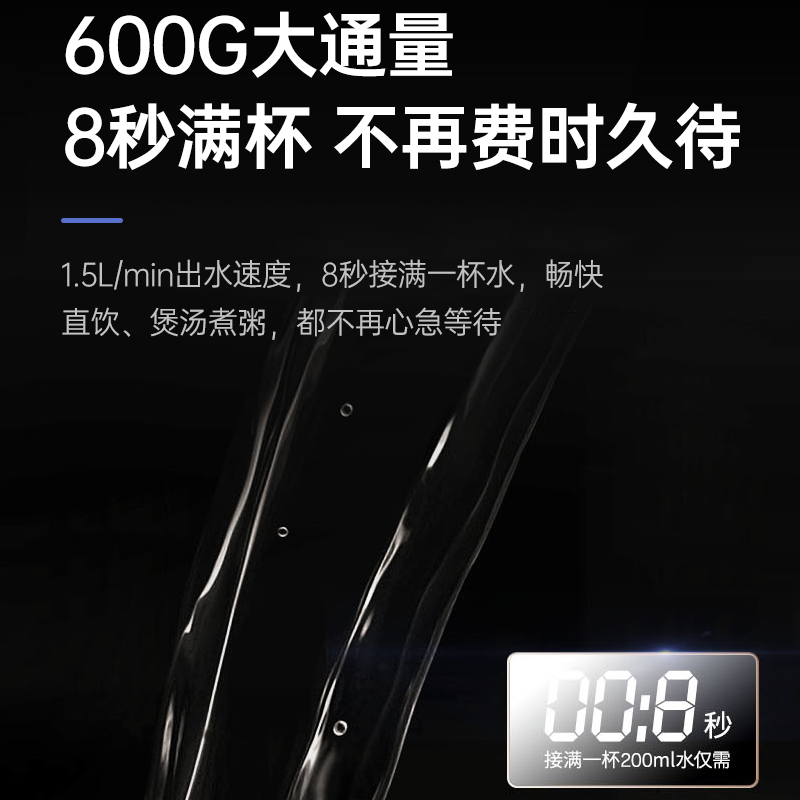 600G大通量,额定总净水量为3000L,采用2年长效RO膜,四芯六级过滤设计,1.57L/min出水速度,8秒接满一杯水,双出水设计,纯废水比为2:1,支持智能冲洗设计,可有效延长RO膜使用寿命,机身带有滤芯寿命指示灯,避免忘记更换滤芯。