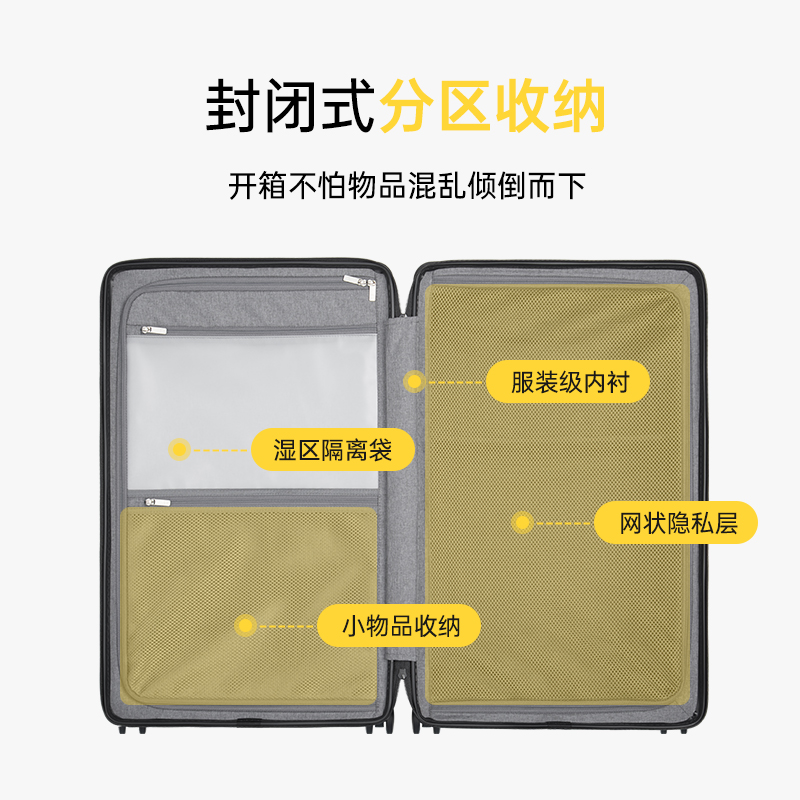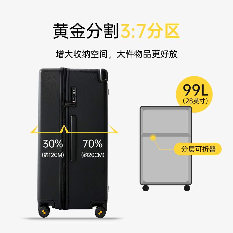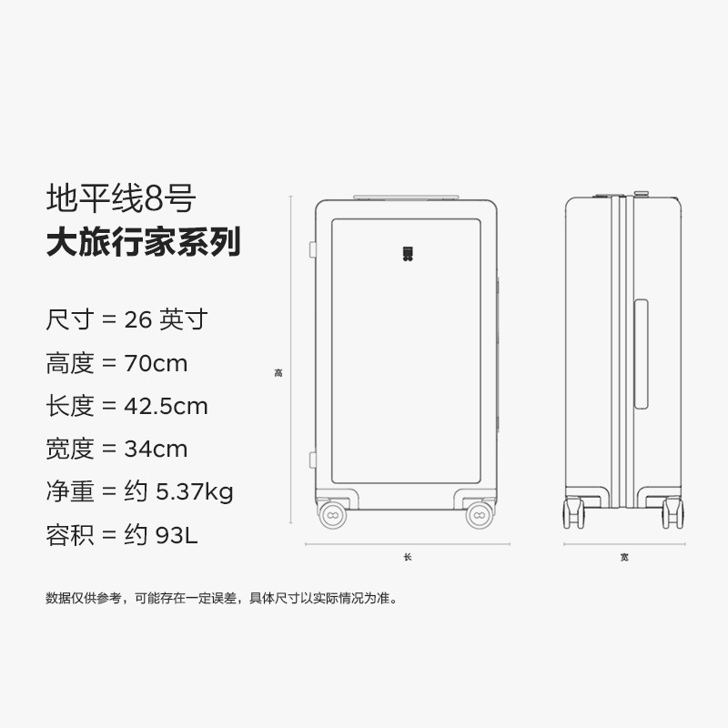 LEVEL8 地平线8号 行李箱拉杆箱 26英寸 ,沿用进口纯PC材质,有效减重的同时足够坚固。铝镁合金宽拉杆的使用,减少了箱体空间的占用,进一步把行李箱的容量扩大到93L,推行更加省力。万向飞机轮采用钢制轴承,顺滑耐磨,越重越好推。YKK拉链使用寿命长,内里分隔层设计使得行李更加整洁,TSA海关锁可轻松应对海关抽检。外观的简洁设计区别于市面上眼花缭乱的条纹设计,耐看而且有品味。