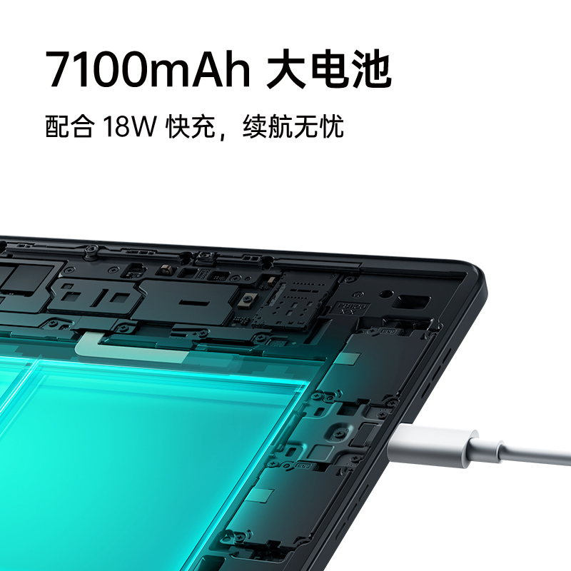配备了7100mAh容量锂电池,支持18W有线快充,其他方面:前置500万像素,后置800万像素摄像头,WiFi5,同时支持OPPO 智能手写笔和OPPO 智能蓝牙键盘。