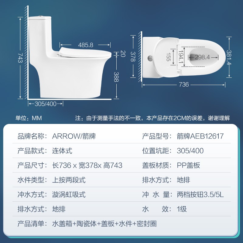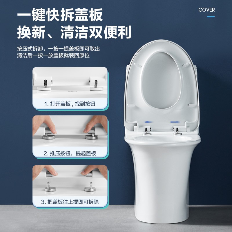 纤薄盖板设计,厚度仅为2cm,线条简约流畅,百搭不挑风格。超强冲力,旋涡虹吸,2个喷射孔+2个辅冲孔,轻松实现360°漩冲。马桶经过1260°高温锻造,吸水率低,不易泛黄开裂,承重力佳,内壁的微晶釉面,平整顺滑,不易挂污,50mm大排污孔,管道内壁全施釉,55mm水封,冲的干净。3.5/5L 双档冲水, 一级水效,缓降盖板。一键快拆盖板,日常清洁更方便。