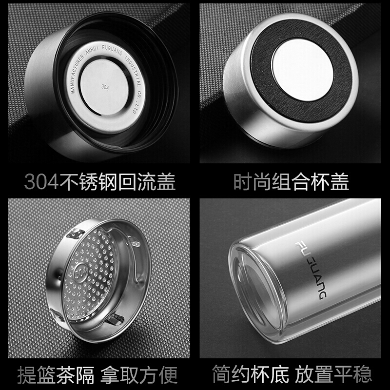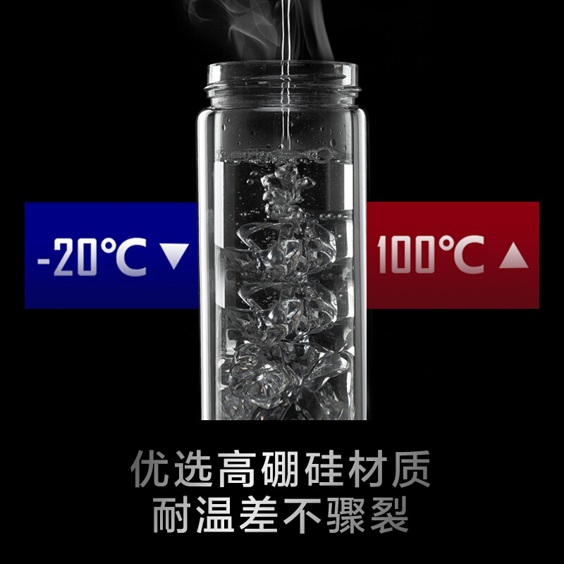 优选高硼硅材质,耐温差不骤裂,杯身选用G3.3高硼硅玻璃,性质稳定,耐-20-100℃瞬间温差不骤裂,不含锰、铅等有害物质,使用更放心,杯盖由仿皮革PP材质和304不锈钢组合而成,中和了不锈钢本色的硬气,在硬朗中加入舒缓柔和,张扬硬汉型男的独特温柔。