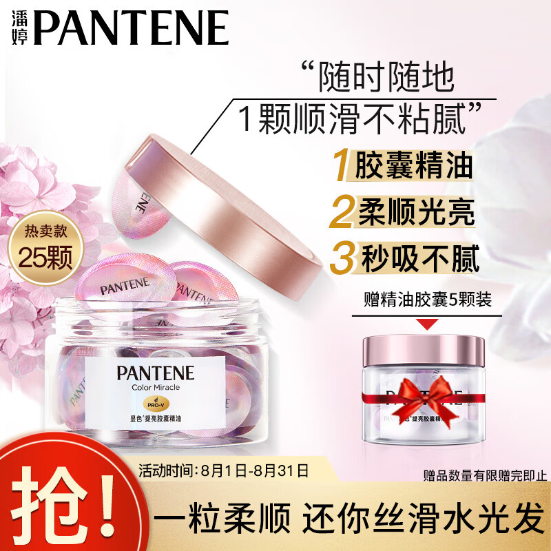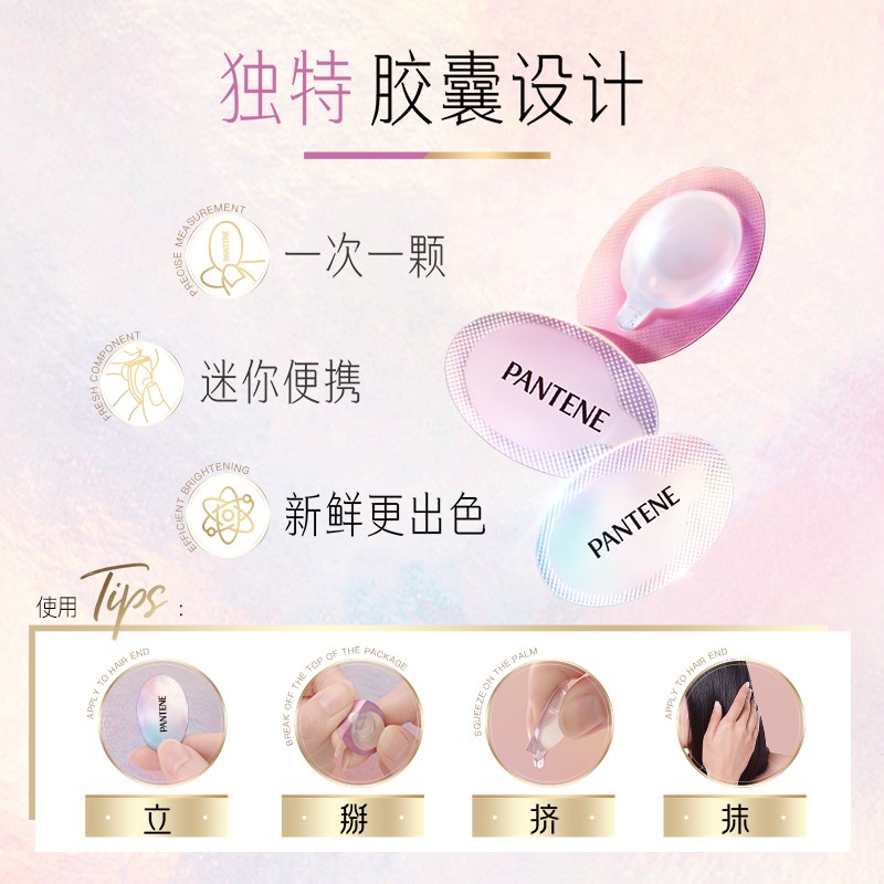 这款PANTENE 潘婷 显色提亮胶囊精油,独特胶囊设计,一次一颗,迷你便携;采用显色膜科技,一瞬成膜,显色不粘腻;高延展性,均匀包裹发丝,质地轻盈,瞬间吸收不油腻。前调:粉嫩玫瑰、粉椒、欧洲大黄;中调:意大利柑橘、绣球花、小羊皮;后调:马杜赖茉莉、广藿香。适用于频繁染发损伤发丝,干枯毛燥、暗哑无光泽发质。