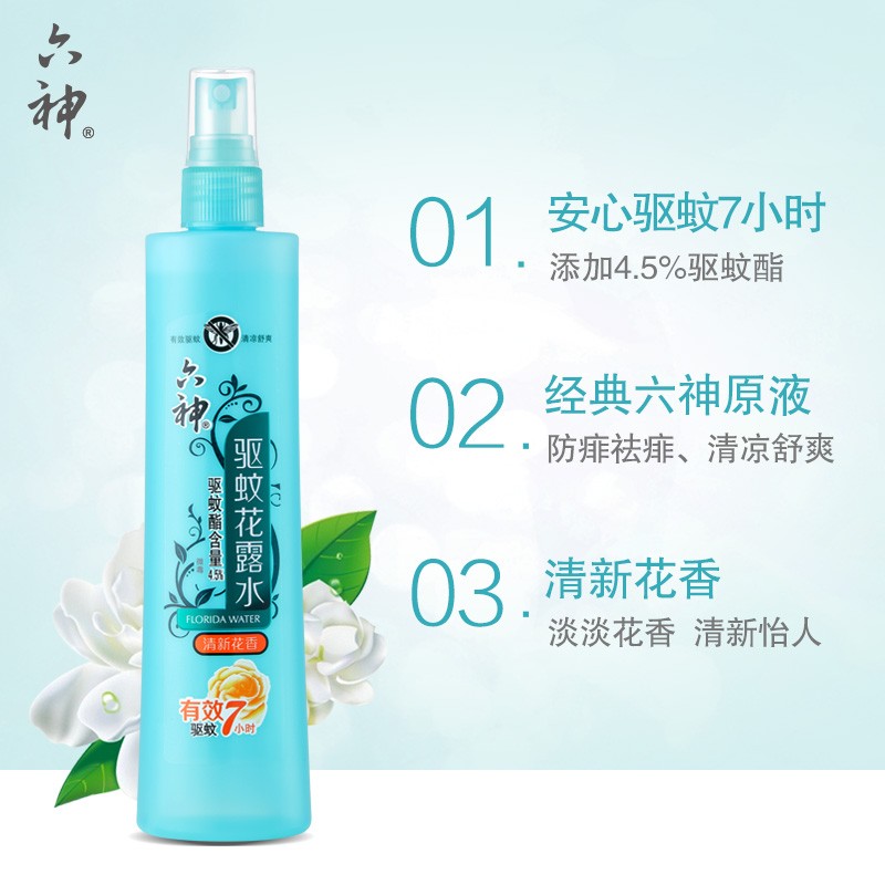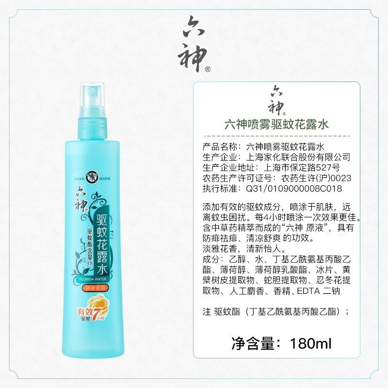 六神 驱蚊花露水 180ml 清新花香 有效驱蚊7小时,清凉舒爽,添加4.5%驱蚊酯,远离蚊虫困扰。经典六神原液,防痱祛痱、清凉舒爽、叫醒小倦怠。清新花香,淡淡花香,清新怡人。清新花香,芳香驱蚊,前调:芳香 薄荷,中调:玫瑰木 茉莉 依兰,尾调:檀香 麝香。家中常备,有效驱蚊,舒适度夏,外出游玩,不怕蚊虫咬,开心玩耍。