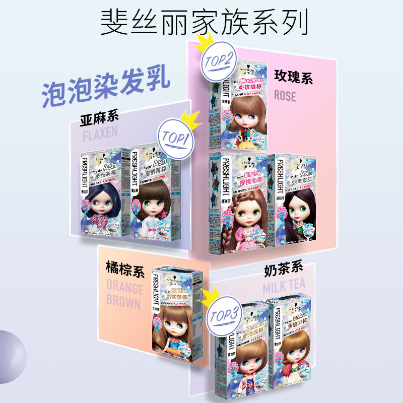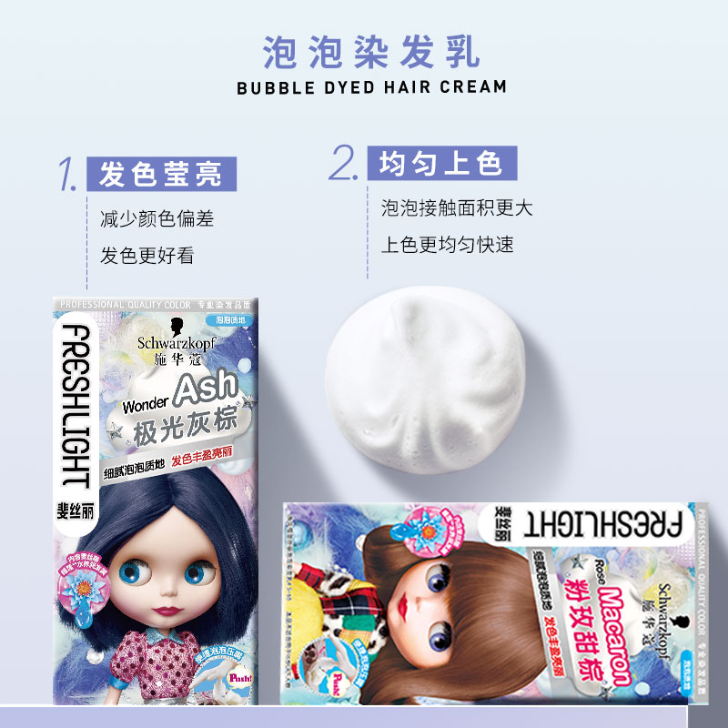 施华蔻斐丝丽,是全球知名的*级时尚玩偶Blythe娃娃与施华蔻联合设计的系列品牌,外包装比较受萌妹子们欢迎。这款Schwarzkopf 施华蔻 斐丝丽系列氨基酸泡泡染发剂,富含8种氨基酸成分,保护秀发柔韧性,自然莹亮,柔润顺滑,绵密泡泡,染发更健康,上色更安心。使用起来方便,只要混合后换上起泡喷嘴,即可压出绵密泡沫,像平时洗发一样在发丝上轻轻按摩并停留即可。含有兰花提取物和保湿润护成分,能够在染发的同时深层修护,使发丝染后顺滑。