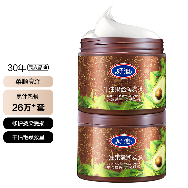 好迪推出的这款牛油果盈润发膜,富含牛油果滋养精华、柠檬酸、丝源角蛋白等多种美发成分,可滋润养护发丝,修护受损发质,改善头发干枯和毛躁问题,令秀发盈亮丝滑。膏体气味幽香,质地细腻,易冲洗不油腻。适合干枯、受损等多种发质。