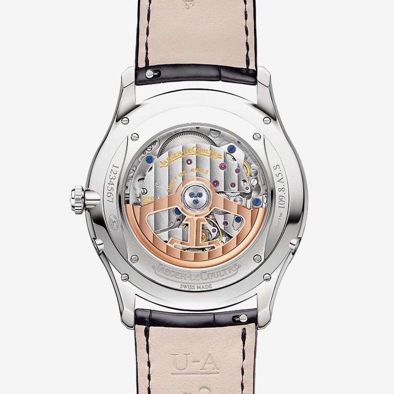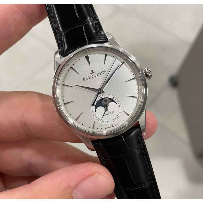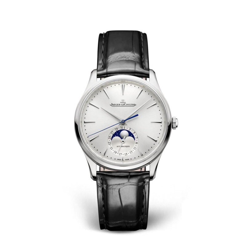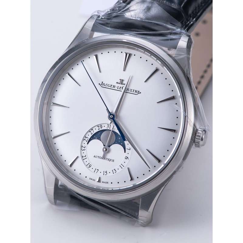 JAEGER-LECOULTRE 积家 超薄大师系列 男士自动机械表 Q1368430,简洁线条勾勒出轻薄表身,表盘饰以太阳放射状纹饰,在任何场合均散发典雅气质,尽显别具一格的魅力,一轮明月与午夜蓝色,形成鲜明对比,令人着迷,6时位置的月相视窗周围,一枚精巧的小指针指示日期,大工坊的制表大师,充分优化机芯性能与稳定性,并将动力储存提高至70小时。透过蓝宝石水晶透明底盖,机芯精美润饰一览无余。