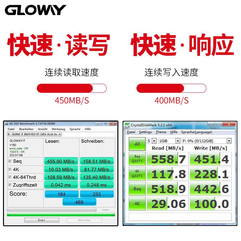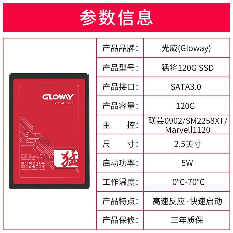 GLOWAY猛将固态硬盘在光威的产品线当中在悍将系列之下,是一款主打性价比的SSD系列,厂家承诺三年质保。SSD的外形尺寸为100mm×69.85mm×7mm,工作温度为0°C-70°C,支持TRIM。产品使用SATA 6Gb/s(SATA III)接口,具体的主控芯片、闪存芯片暂不明,厂家只说明了是精选颗粒。根据厂家数据,在AS SSD Benchmark测试当中360GB版本的猛将固态硬盘得分可以过千,具体的持续读取速度450MB/s,持续写入速度430MB/s左右。