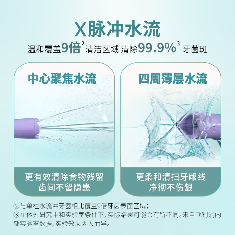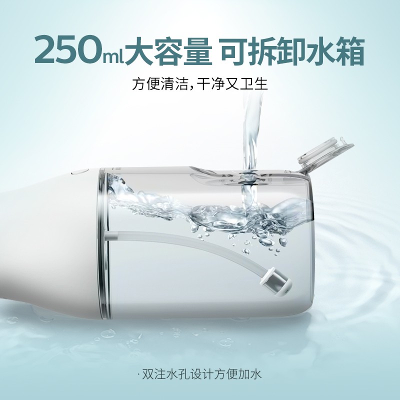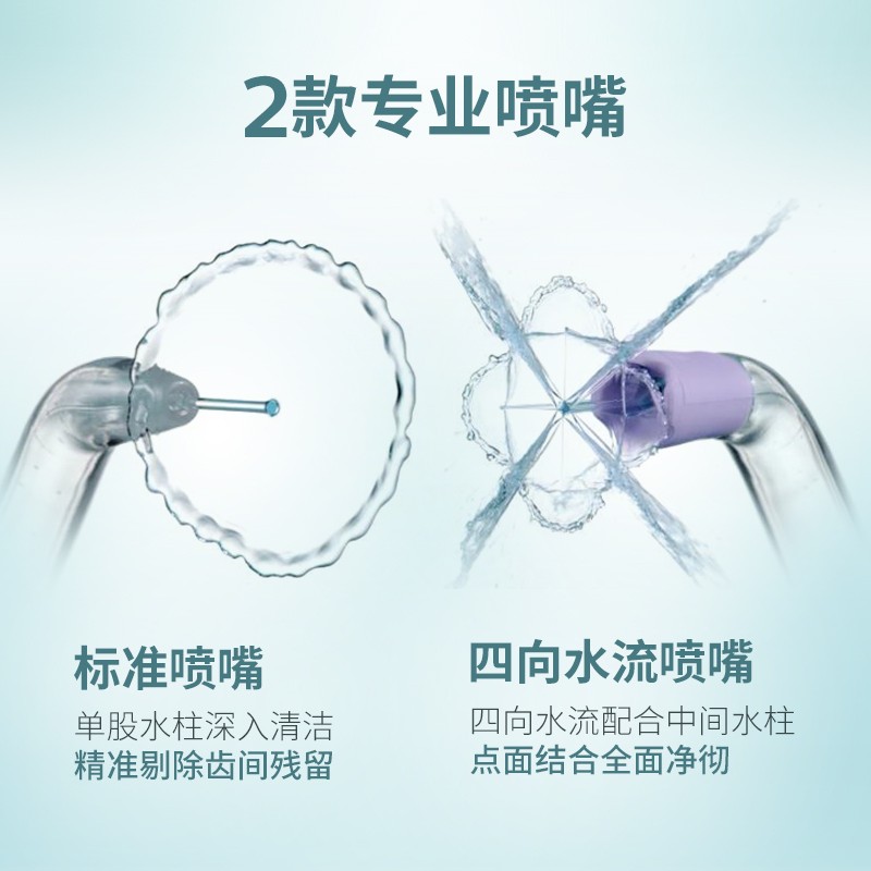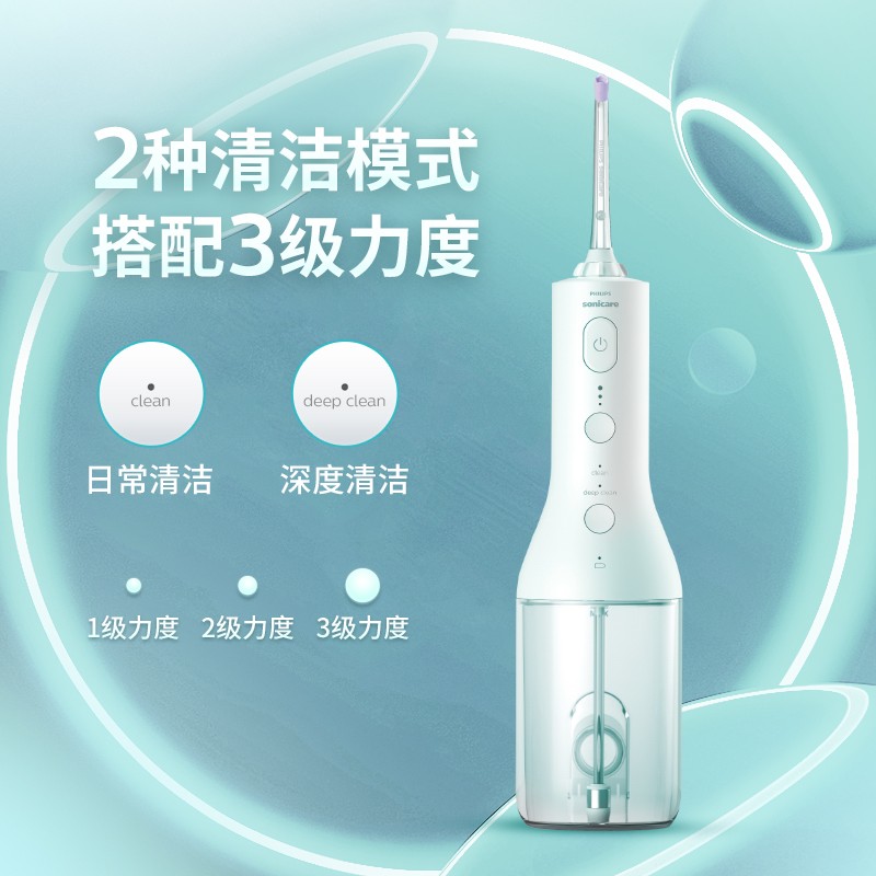 飞利浦HX3806冲牙器,采用X脉冲水流,具有2大清洁模式,包括日常清洁模式和深度清洁模式,支持3级力度调节,配备2款专业喷嘴,包括标准喷嘴和四向水流喷嘴,水箱容量250mL。