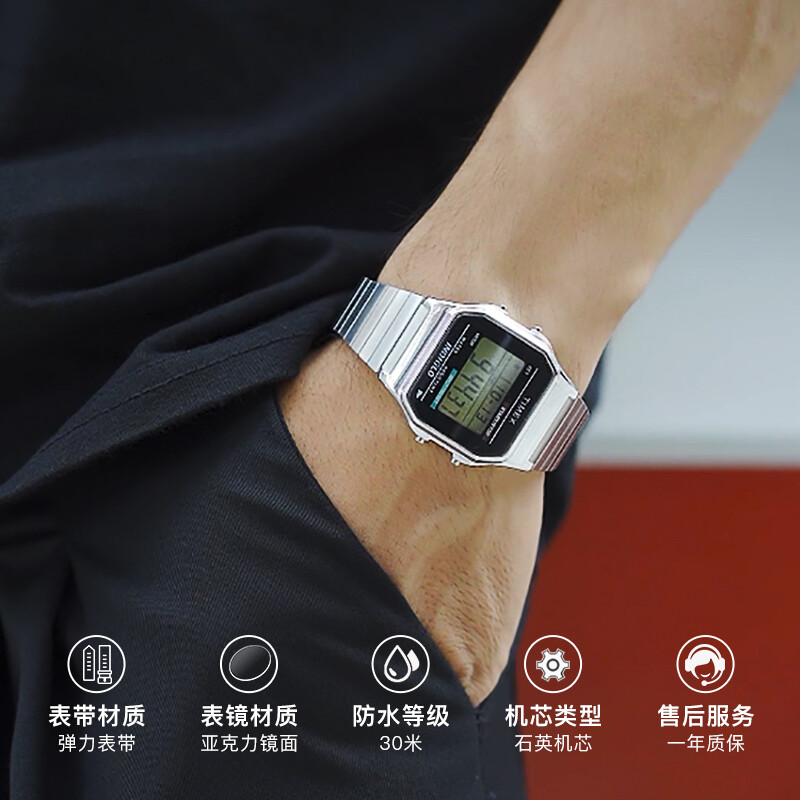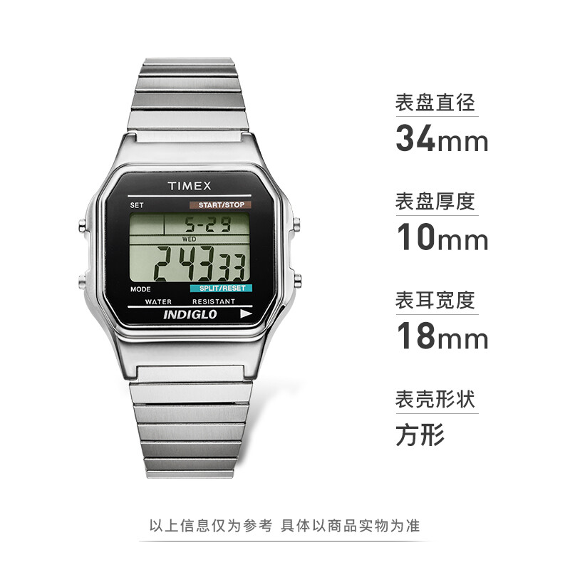 此款手表TIMEX 天美时 男士电子手表 T78587,该手表电子机芯,表盘直径34mm,防水深度30米。潮流小方块,金属方形外框玩转摩登复古风格始于经典,适应多样化搭配需求。无表扣设计,金属表带表带提升舒适度,减轻手表重量,金属材质将坚韧推向新高度。