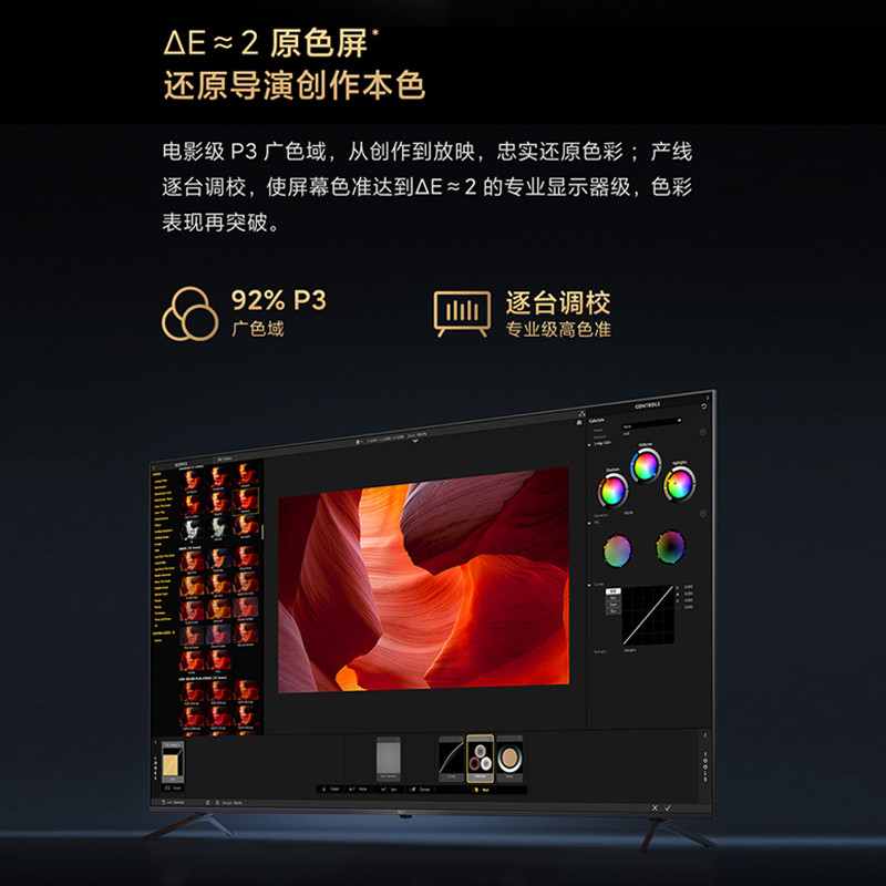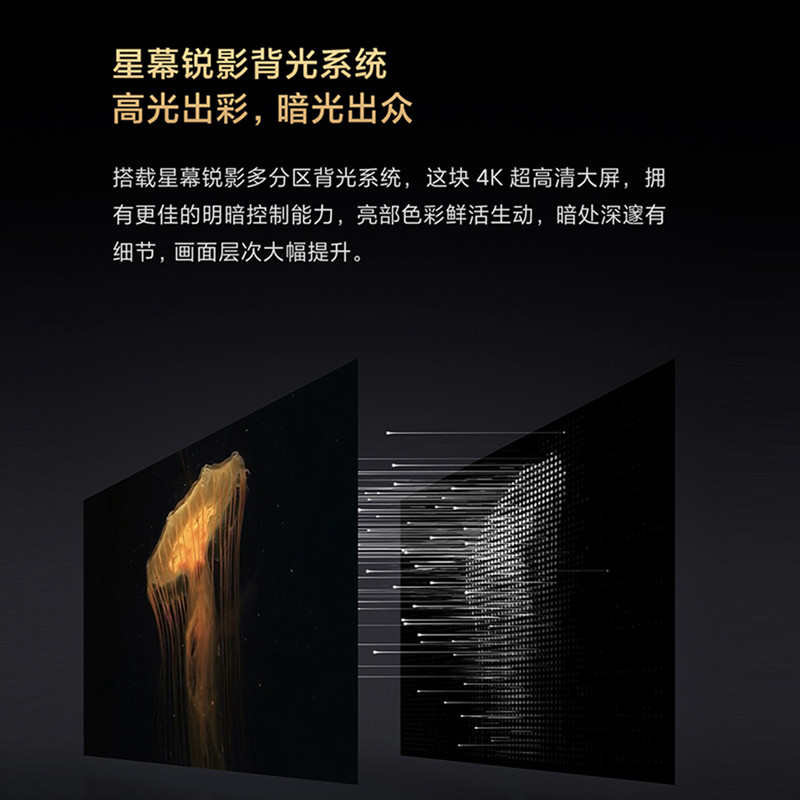 采用4K全面屏设计,屏占比达到97.25%,拥有4DCI-P3 92%广色域覆盖范围,支持双120HZ高刷、MEMC运动补偿,搭载90分区动态背光系统,AI动态场景识别,智能调校色彩、清晰度、对比度,同时还支持杜比视界、HDR10+ 、HDR10和HLG。配置方面,搭载22nm制程MTK 9650电视芯片,四核A73 CPU 架构+Mali G52 MC1 GPU架构,配备2GB+32GB存储组合、HDMI 2.1标准接口。