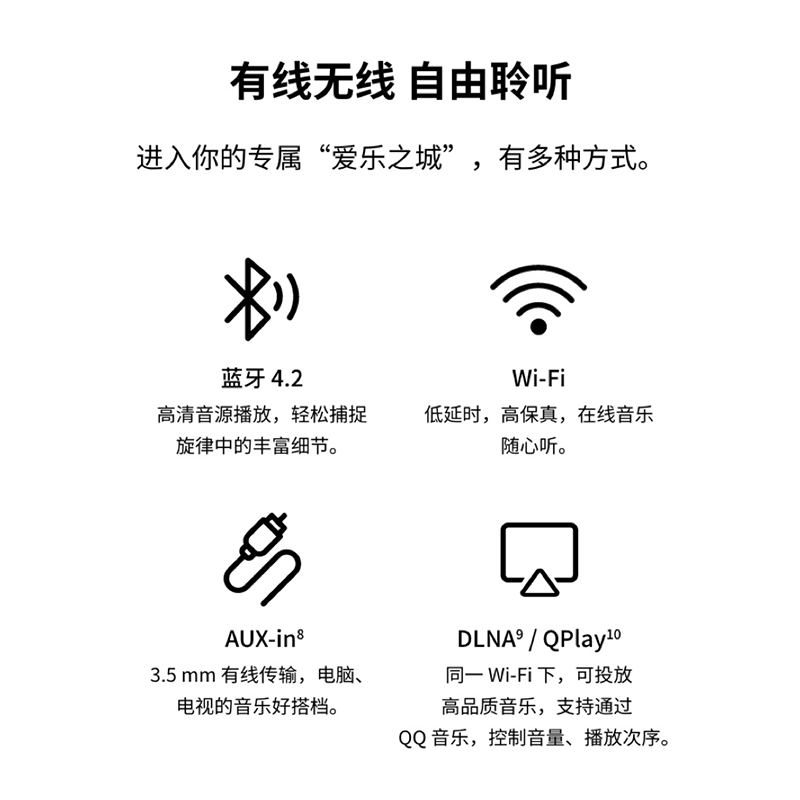 携手帝瓦雷,只为震撼聆听,该智能音箱搭载定制帝瓦雷六单元四喇叭配合独家Push-Push振动平衡声学设计,定制低音喇叭,爆发力十足,采用帝瓦雷独有的SAM控制双被动单元的准确位移,赋予低音喇叭更强。三个全频喇叭带来激昂式中高音。手机轻碰音箱,高清音乐即刻投放。低频调节功能,手动切换低音的强弱程度。