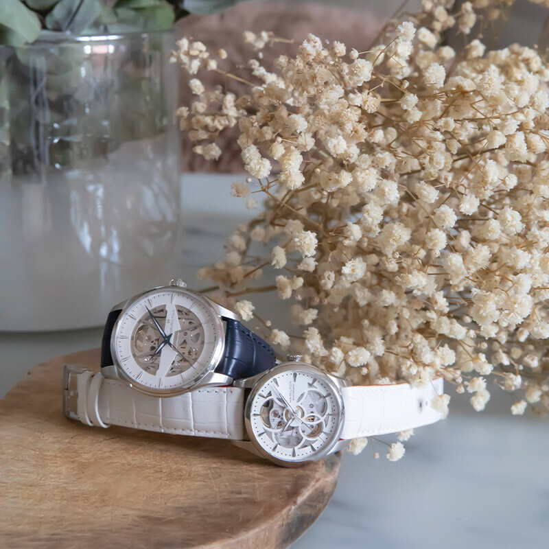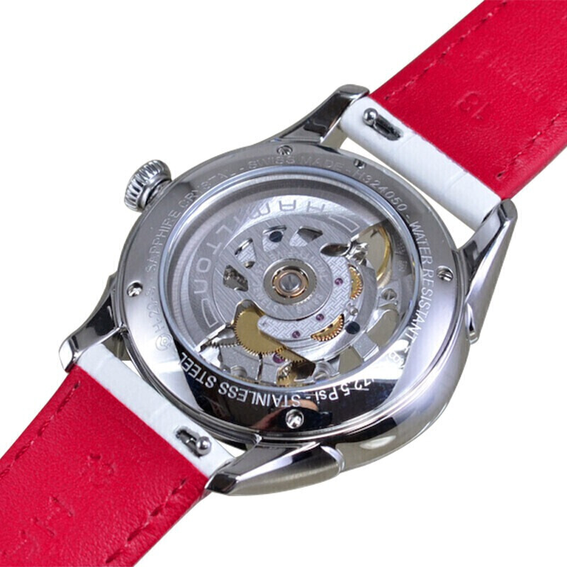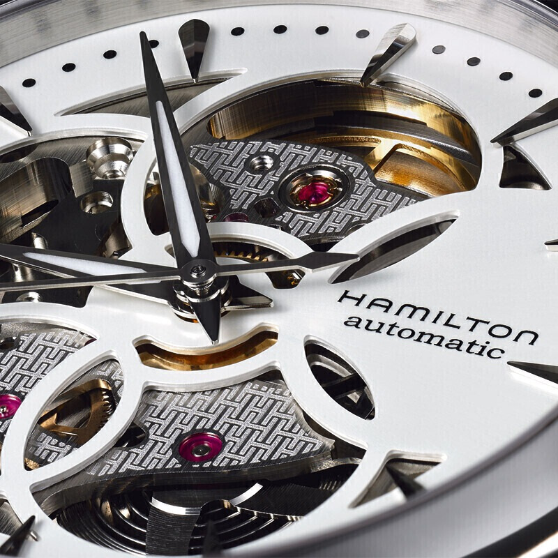 HAMILTON 汉米尔顿 爵士系列 女士自动上链机械手表 H32405811 。采用H-20-S机械机芯,H-20-S是汉米尔顿的镂空机芯之一,使设计师得以创作以机芯为焦点的腕表。通过简洁利落的表盘及醒目图案,H-20-5机芯为传统的精准机芯增添一抹剧场式的艺术气息。此款表盘直径36mm,背透表底,可以清晰欣赏机芯运作,防水深度50米,日常水溅不畏惧。