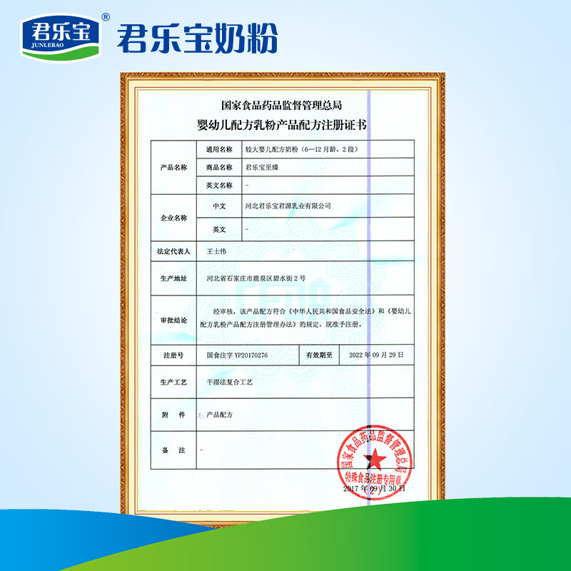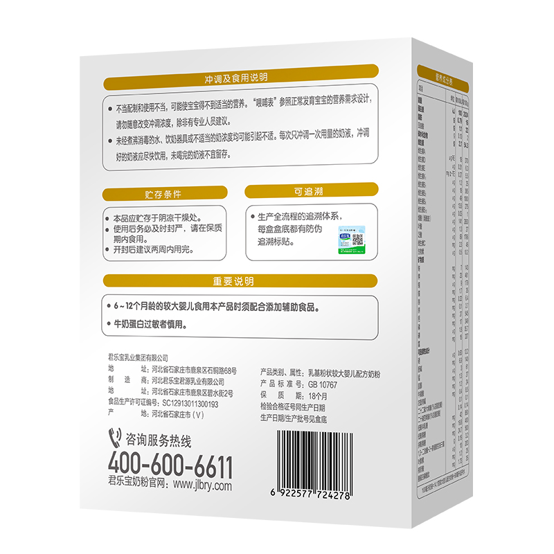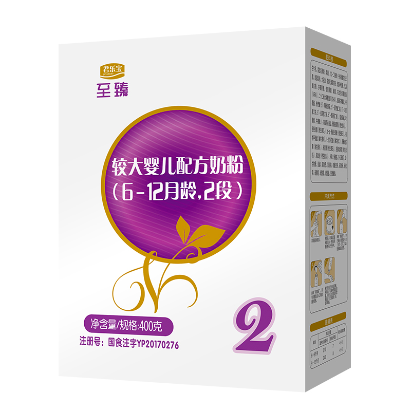 君乐宝成立于1995年,是河北省最大的乳制品加工企业,产品范围包括婴幼儿奶粉、低温酸奶、常温液态奶、牧业四大板块,其中婴幼儿奶粉在2014年正式开始生产,旗下有至臻、乐铂、恬适、乐纯、旗帜、乐臻、小小鲁班等系列,这款至臻系列主打的卖点是添加了优量的CPP(酪蛋白磷酸肽),每100g含有35mgCPP,能有效地促进人体对钙、铁、锌等微量元素的吸收和利用,有利于宝宝骨骼发育,还添加了OPO结构油脂,帮助宝宝更好的吸收和消化营养,减少便秘的发生,配方中还含有3大类营养元素,5种核苷酸促进宝宝生长发育,3重益生元呵护宝宝肠道健康,α-乳清蛋白小分子更易吸收宝宝肚肚舒服。