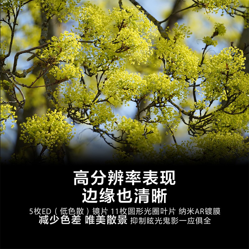 采用 17 组 24 片光学结构,包含 1 片非球,5 片 ED,可较大限度地减少色差,镜组由 DDSSM 超声波马达驱动,能快速、精准、安静并且持续锁定追踪移动的物体。11 枚圆形光圈叶片,可营造柔顺的散景效果。镜头采用纳米 AR 镀膜,减少逆光拍摄时产生的眩光和鬼影。此外,镜头前后端镜片上还具备氟镀膜涂层,在户外使用环境下能很大程度上减少镜头表面沾染灰尘和指纹。