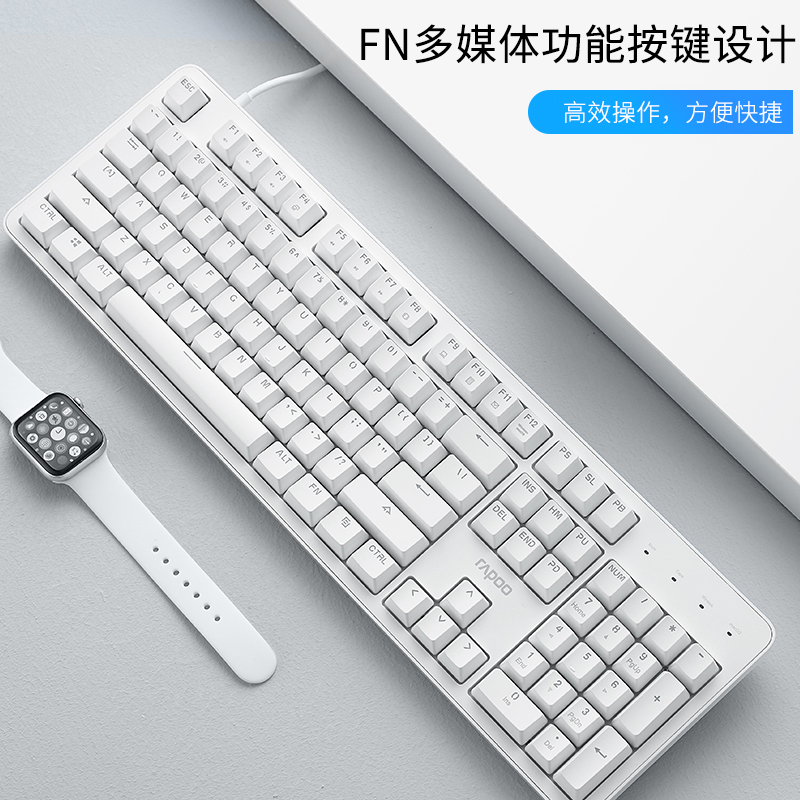 PC+ABS双色注塑,细颗粒触感,有力支持日常敲击,不易褪色刮花,不易打油。USB口连接即可实现全104键无冲突,支持同时输入,能准确地记录下每一个按键输入的指令。4块防滑脚垫,2个坚固倾斜支架,1.8m线长,满足日常使用。