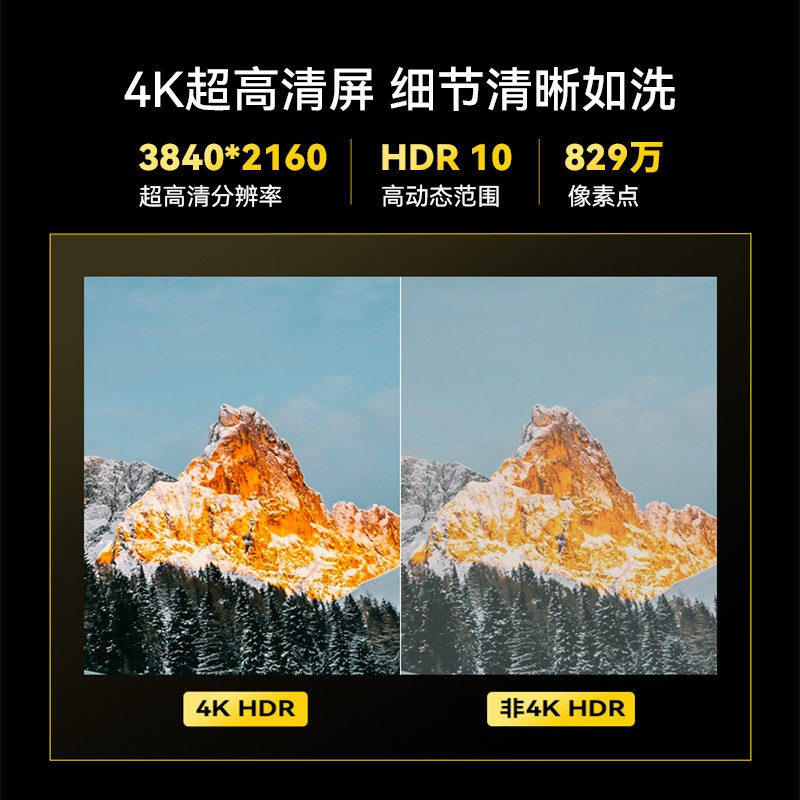 3840x2160超高清分辨率,搭载HDR10高动态范围 图像解析,还原真实自然的色彩,呈现丰富的细节,10.7亿惊艳色彩组合,大自然万干色彩绚丽真实 屏幕显现层次感更强,帧帧细腻入微。