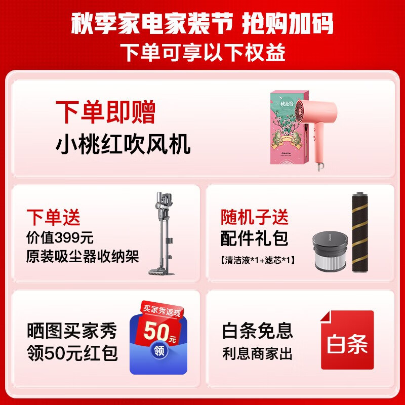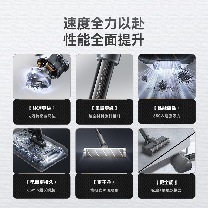 追觅(dreame)V16手持式吸尘器于2021年9月发布,采用自研SPACE 6.0高速无刷马达,最高转速16万转/分钟,整机功率650W,支持“持久”、“强劲”、“超强”三挡吸力调节,最长续航能力达到85分钟。延长杆使用碳纤维材质,相比传统的金属杆轻了29%。内置12锥旋风分离系统,可实现最高99.6%的尘气分离。配备高清全彩显示屏,机器状态一目了然。搭载背投式照明地刷,并配备光感传感器,黑暗环境自动照明清洁;附赠旋转擦地吸头,配合200mL水箱更好去除顽固污渍;其它配件包括肘弯式转接头、宽扁吸、软毛刷、窄缝照明吸头等。