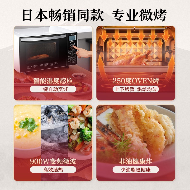 【智能湿度感应】绝对湿度传感器,无需设置,一键启动烹饪;【250度OVEN烤】上下烤管同时加热,保证墙体有充分热量,100-250℃,轻松实现烘焙、烤肉;【变频微波】900W变频微波,4档火力精准匹配,高效速热;【快速菜单】牛奶、土司、饭菜独立按键,快速加热【非油健康炸】高温实现健康炸、烤功能,减少油脂摄入,保持诱人口感;