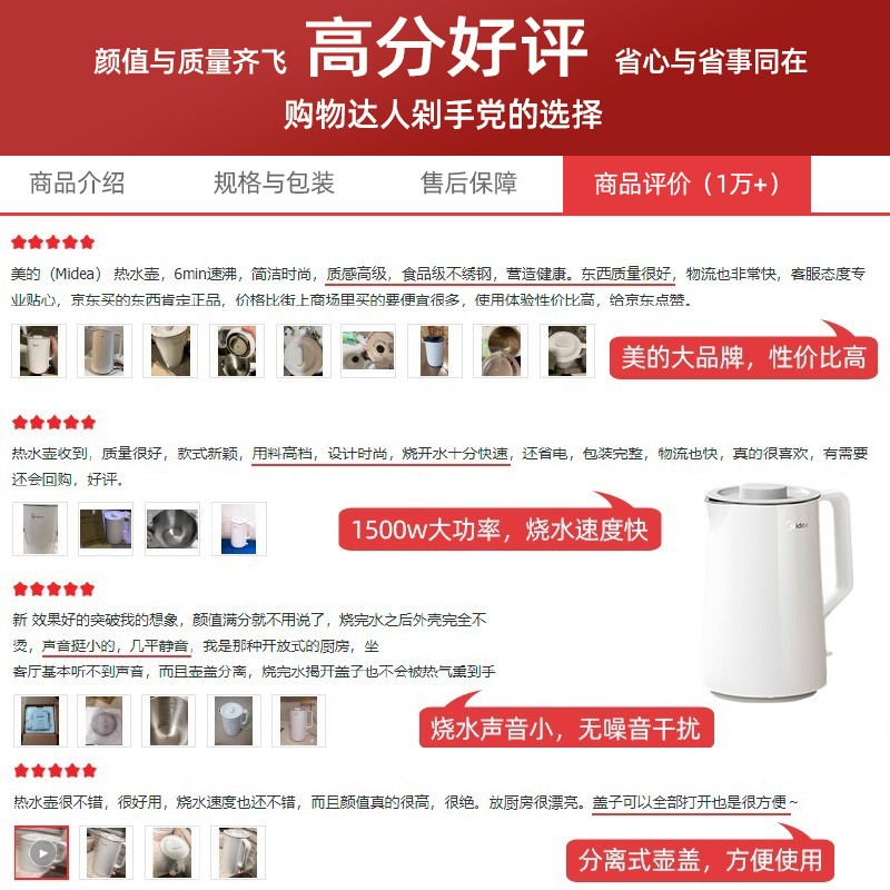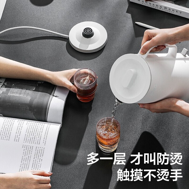 国家标准食品级304不锈钢,一壶健康水就是这么简单。304不锈钢内胆,一体成型、耐腐蚀、 不易藏污纳垢。1500W大功率加热,快速沸腾,烧水不久候。