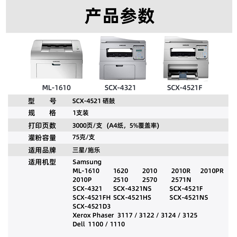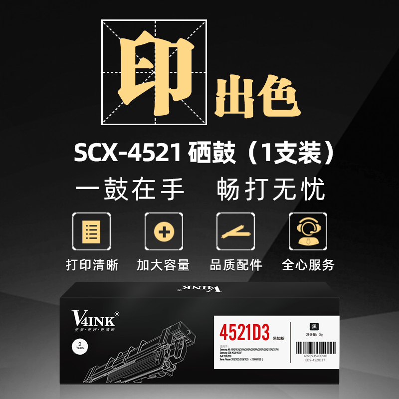 V4INK 维芙茵 SCX-4521D3 硒鼓,参数方面,颜色为黑色,适用于Samsung ML-1610/1620/2010/2010R/2010PR/2010P/2510/2570/2571N Samsung SCX-4321/4521F Dell 1100/1110, Xerox Phaser 3117/3122/3124/3125 (106R01159)。打印量为3000页。使用方面,使用多种机型,提升产品适用性。甄选优质鼓芯,工作稳定性强,各种环境保持出色成像,选用高质量碳粉,颗粒细腻不伤打印机,能耗更少,打印更快,体积更小,打印更多,图文细腻,黑白分明。使用高品质胶件,持久耐用,呵护核心部件。