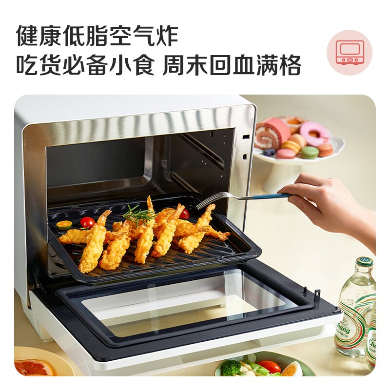 蜂窝穹顶,受热更均匀,立体烘烤,上下回字形不锈钢烤管设计,打造全域立体黄金温区360°均匀烘烤,着色金黄,一键上色,快速锁鲜随心蒸,60分钟超长续航,低脂空气炸,健康无负担,30道自动菜单,小白轻松上手,3档消毒模式,高温除菌。