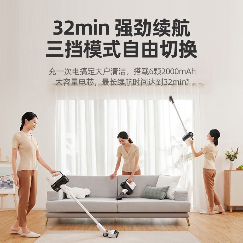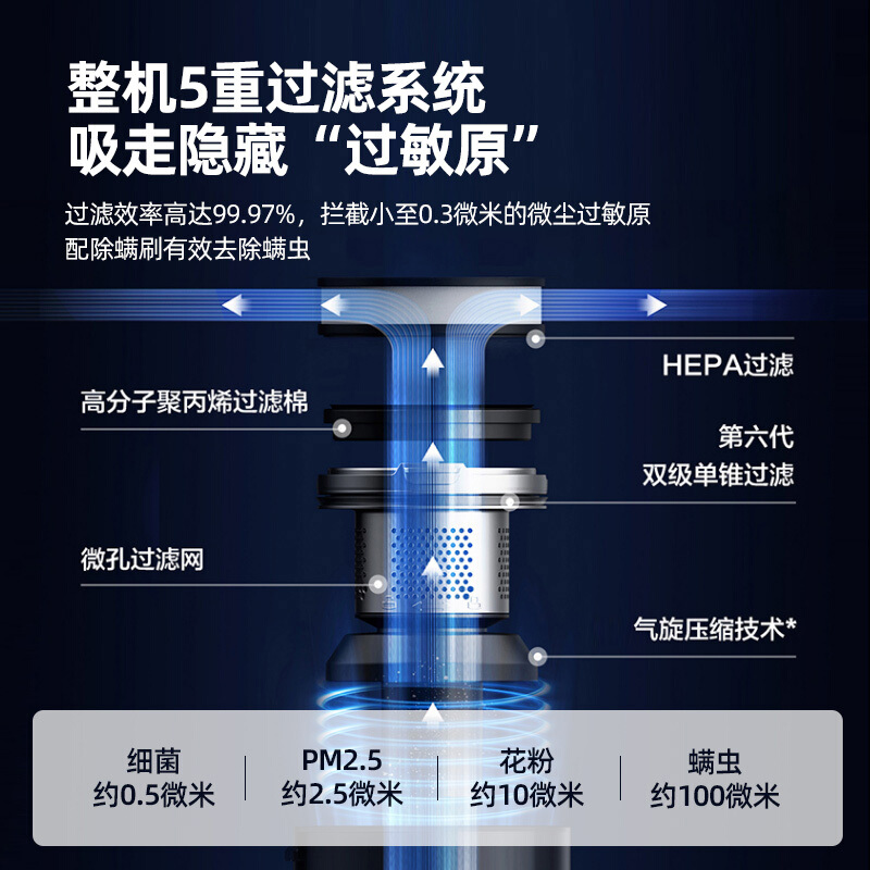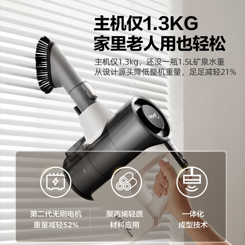 主机仅1.3KG,单手轻快吸,从设计源头降低整机重量, 重量足足减轻21%。第2代高性能无刷电机,转速高达1.5万转/min, 可稳定输出19kPa强劲吸力,有效拔除各类微尘。双级单锥分离系统,将大颗粒微尘甩到尘杯 底部,减轻过件负荷,同时防止二次污染。