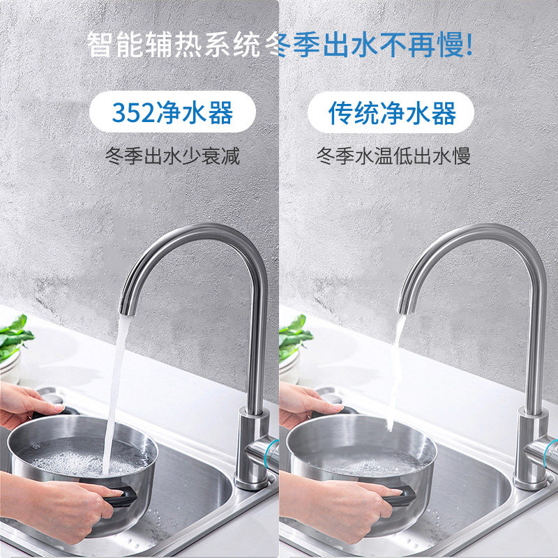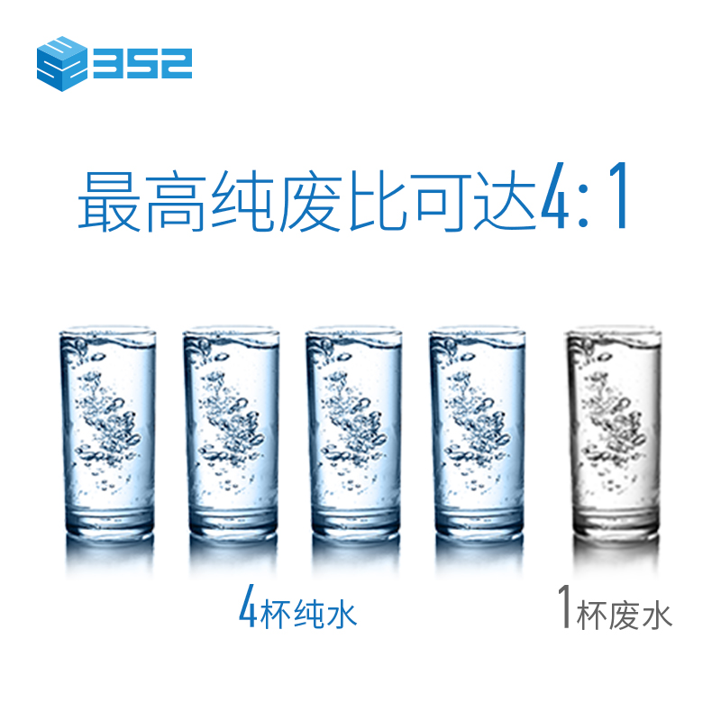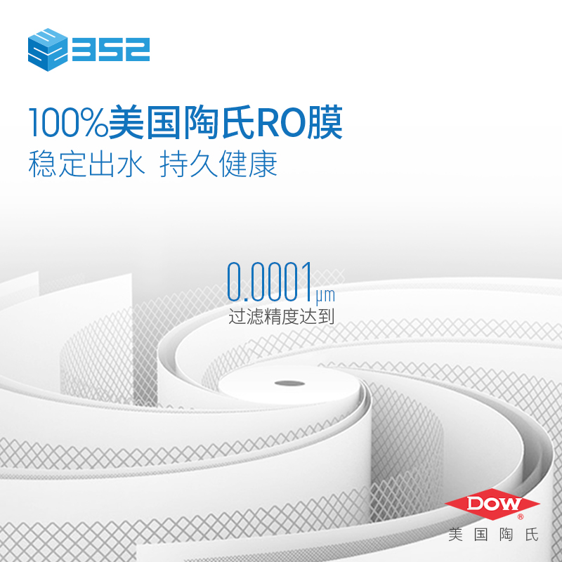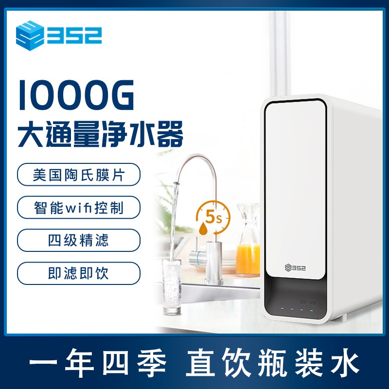 352新品,一款性能强大的“变态”的反渗透纯水机,水流量高达1000G,废水高达比4:1,非常高效,采用进口陶氏RO膜片,理论过滤精度0.0001μm,重金属去除率、细菌去除率、抗生素去除率均为99.9%,有机物去除率为99.7%,放心直饮。双复合滤芯寿命持久,三年只需要更换两次。采用侧抽式设计,非常方便更换,无需师傅上门。调节废水比在4:1到2:1之间,远超新国标1级水效。这款纯水机还配备辅助加热功能,确保寒冷天气和冬季的用水流量。支持自动冲洗功能,可连接手机APP,监控运行情况和水质状态。
