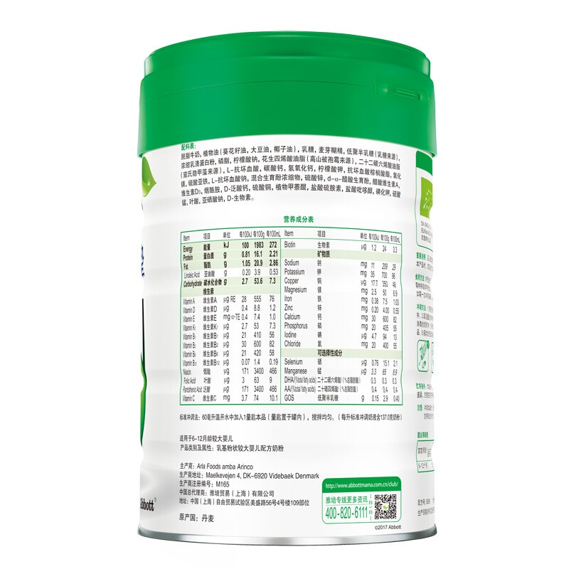 雅培 菁智智护 幼儿配方奶粉,丹麦原装进口,经过权威认证、有机奶源、100智护配方(现为雅培亲体配方)都使得菁智奶粉成为了市面上售卖的高端奶粉之一,此款2段奶粉更是不常见到降价。采用欧洲奶源,溶解和吸收程度彻底;含有的DHA+叶黄素有助于大脑和眼镜发育;POF亲和高效吸收配方,使得宝宝消化吸收好,便便也更软;含有活性益生菌+益生元,增强保护力。规格900g每罐,适合6-18个月婴儿食用。