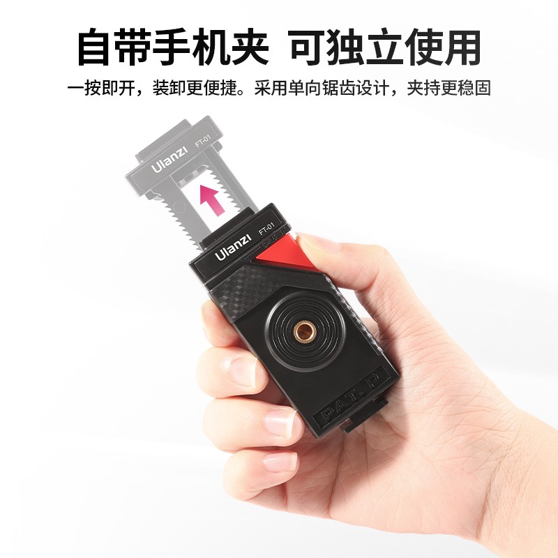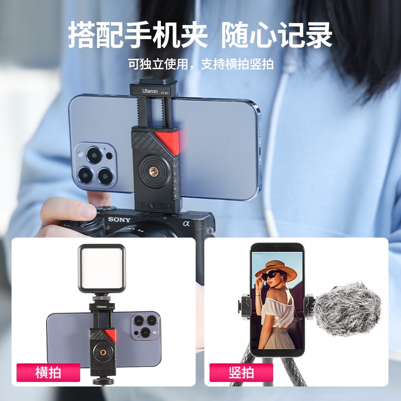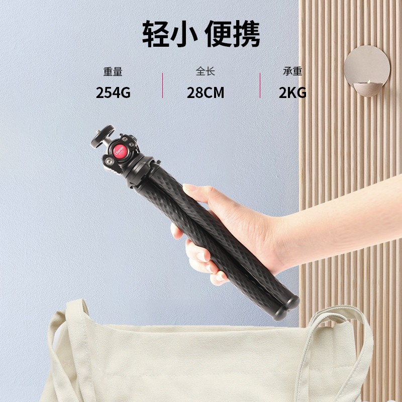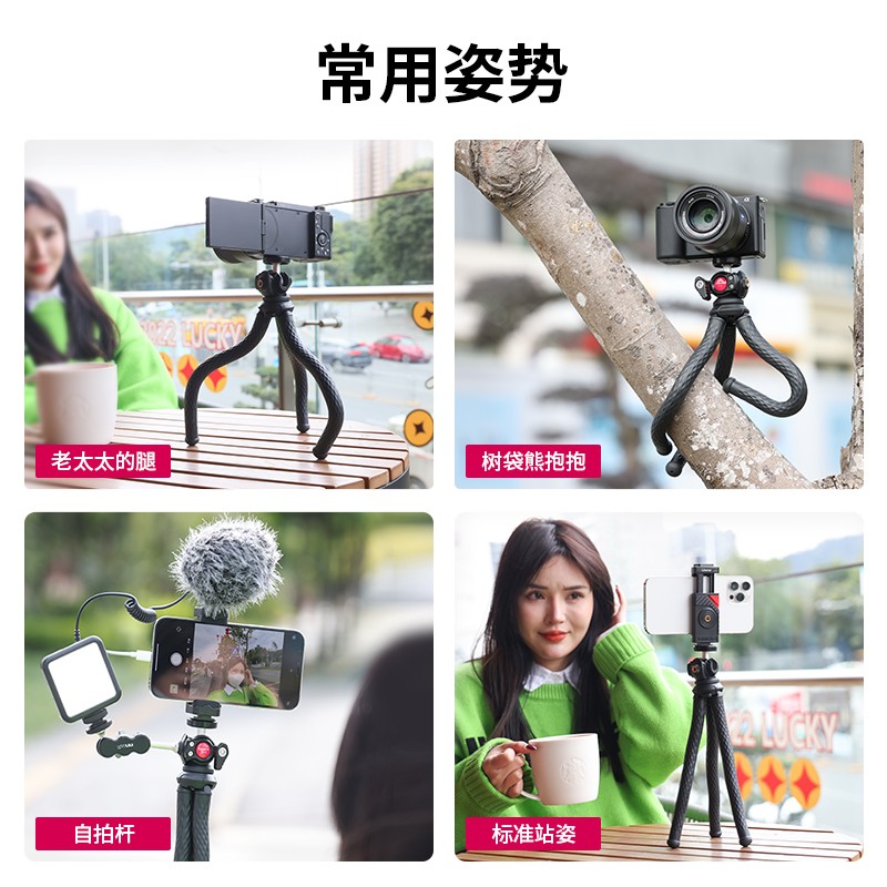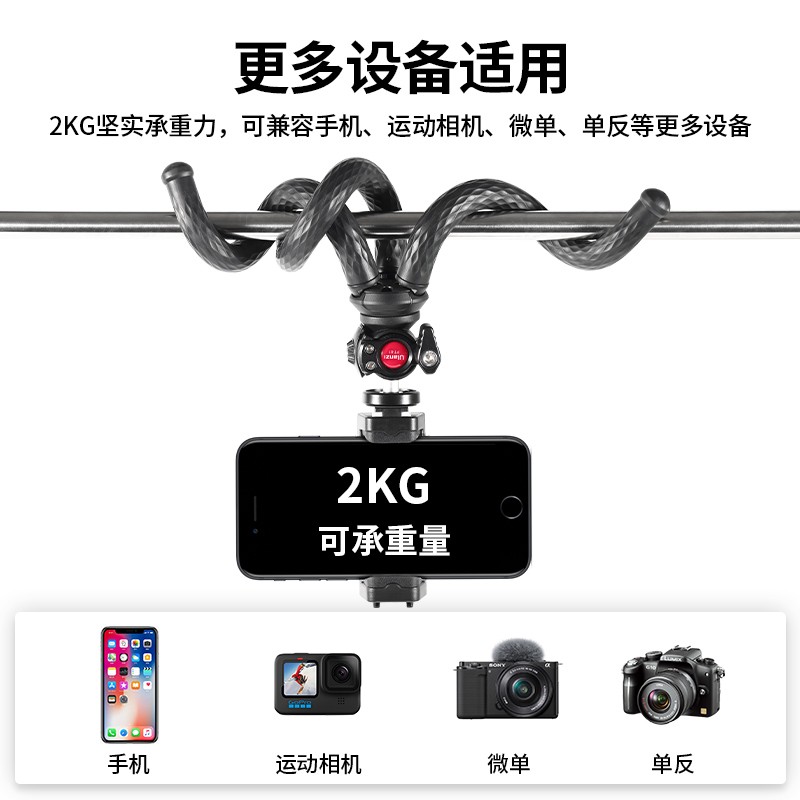 采用TPR高弹胶材质,内置多股金属芯,整体重量仅有254g,全长28cm,可以承重2kg,可以搭配金属球形云台,角度支持360°调节,云台和脚架同时支持分开使用,实用性更好;自带有手机夹,一按即开,同时采用单向的锯齿设计,夹持更稳固。