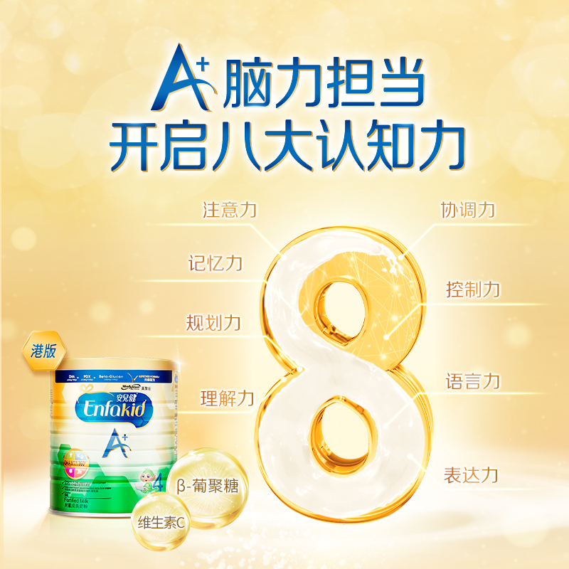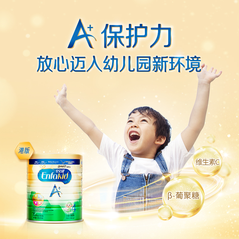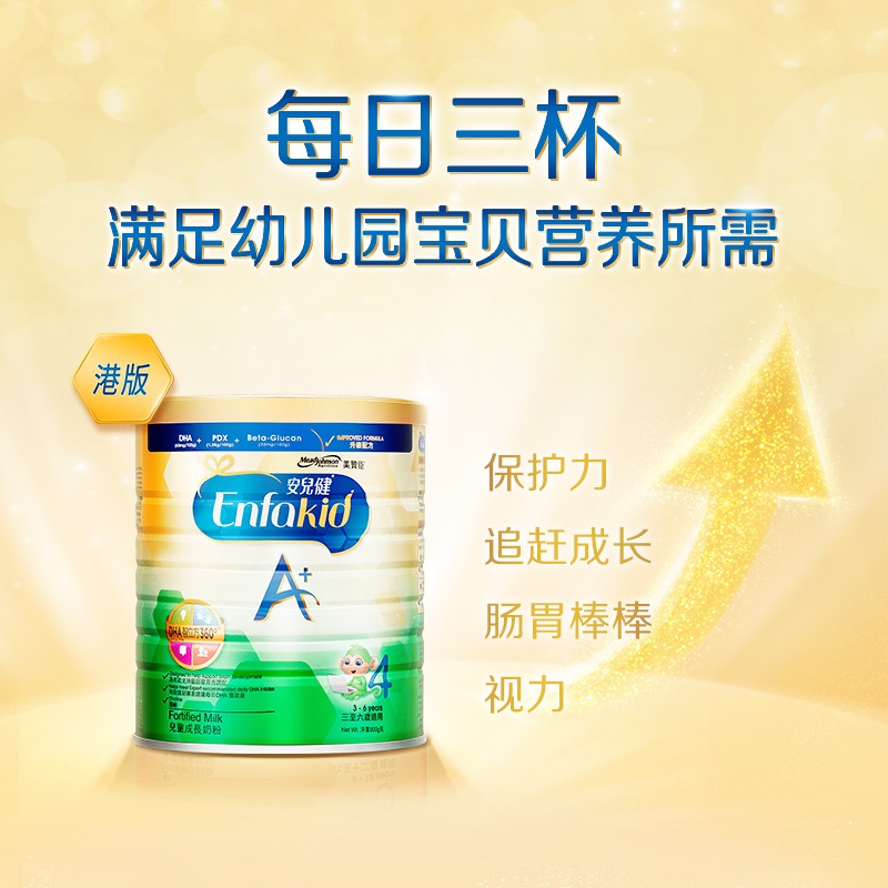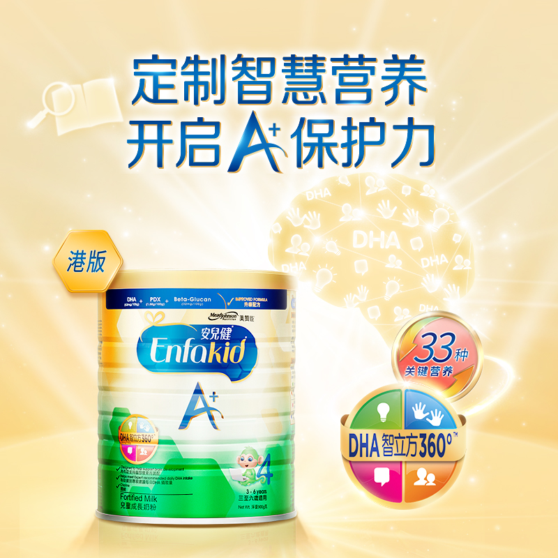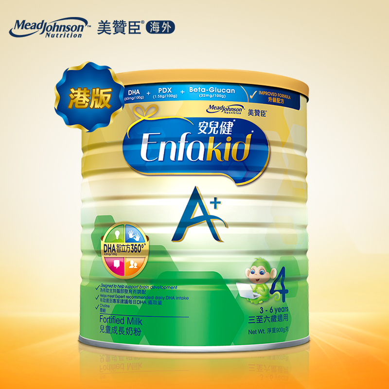 MeadJohnson Nutrition 美赞臣安儿健A+4段配方奶粉,作为一种补充均衡营养的配方食品,适合3岁以上儿童服用。采用全新脑部营养先进配方,含高水平的DHA,特别添加益生元,给宝宝带来A+智力和A+记忆力。全新的益生元组合,给宝宝带来A+保护力。丰富的蛋白质和钙、铁等矿物质及多种维生素,适合3岁或以上儿童。