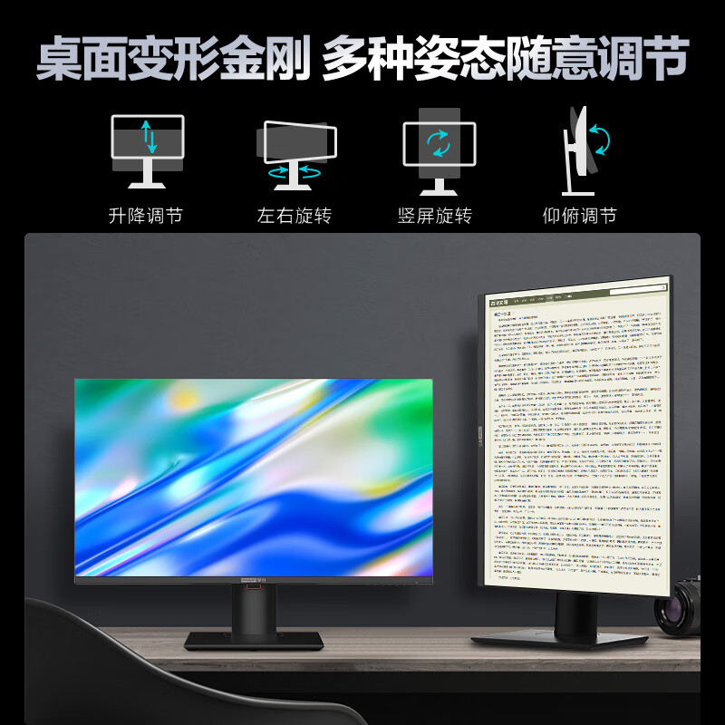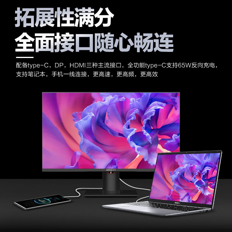 接口方面,提供HDMI2.1、DP1.4以及Type-C接口,Type-C支持65W反向充电,笔记本、手机、平板等设备一线直连。配备多功能人体工学指甲,支持旋转、升降以及俯仰调节。