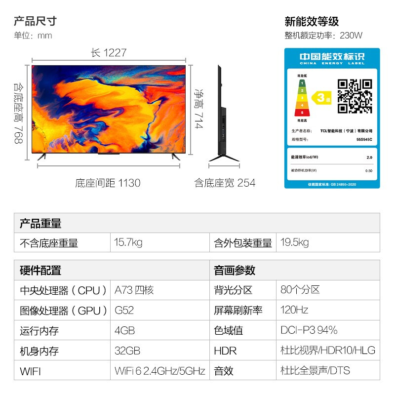 雷鸟S545C系列于2021年9月发布,包括55英寸、65英寸和75英寸三个版本,采用120Hz面板,峰值亮度750尼特,棋盘式分区背光(55英寸背光分区数量为80个、65英寸背光分区数量为90个,75英寸背光分区数量为120个),94% DCI-P3广色域,支持MEMC动态补偿;配备HDMI2.1接口,支持VRR、ALLM等,游戏模式下输入延迟为12ms;采用MTK9652处理器,4GB内存+32GB存储空间,支持蓝牙5.2;支持远场语音操控,12米远距离拾音;采用全面屏设计,拥有超高屏占比。