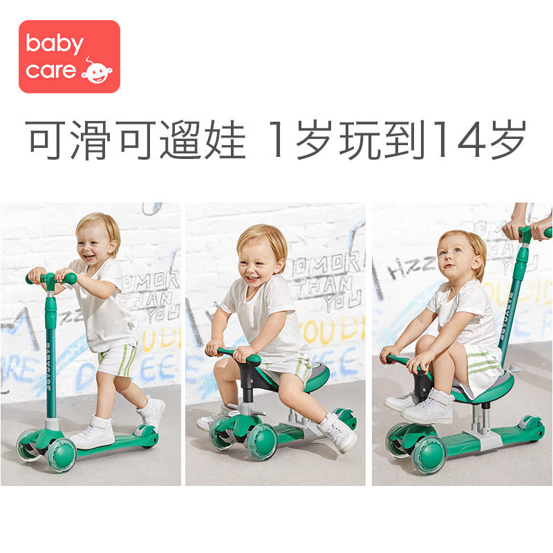 babycare儿童滑板车 三合一,溜娃手推车、滑行平衡车、滑板车模式,3种模式,轻松切换,适配不同年龄阶段宝宝需求,陪伴宝宝1岁玩到15岁;多档位一件调节,快速拆卸变换;13cm加购PU轮,减震耐磨,智能重力转向,轻松转弯。