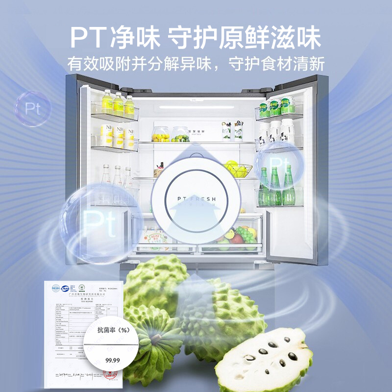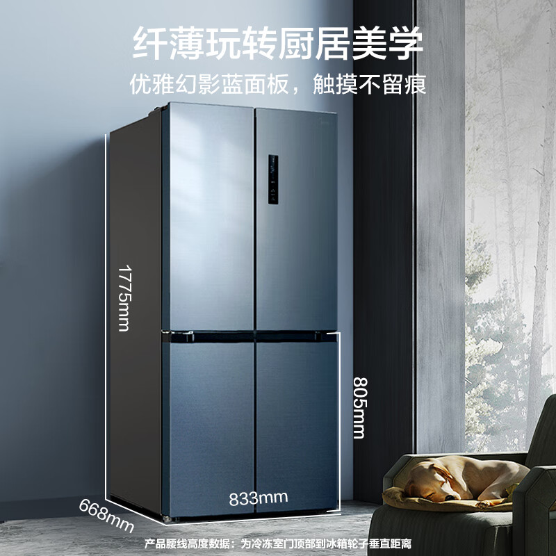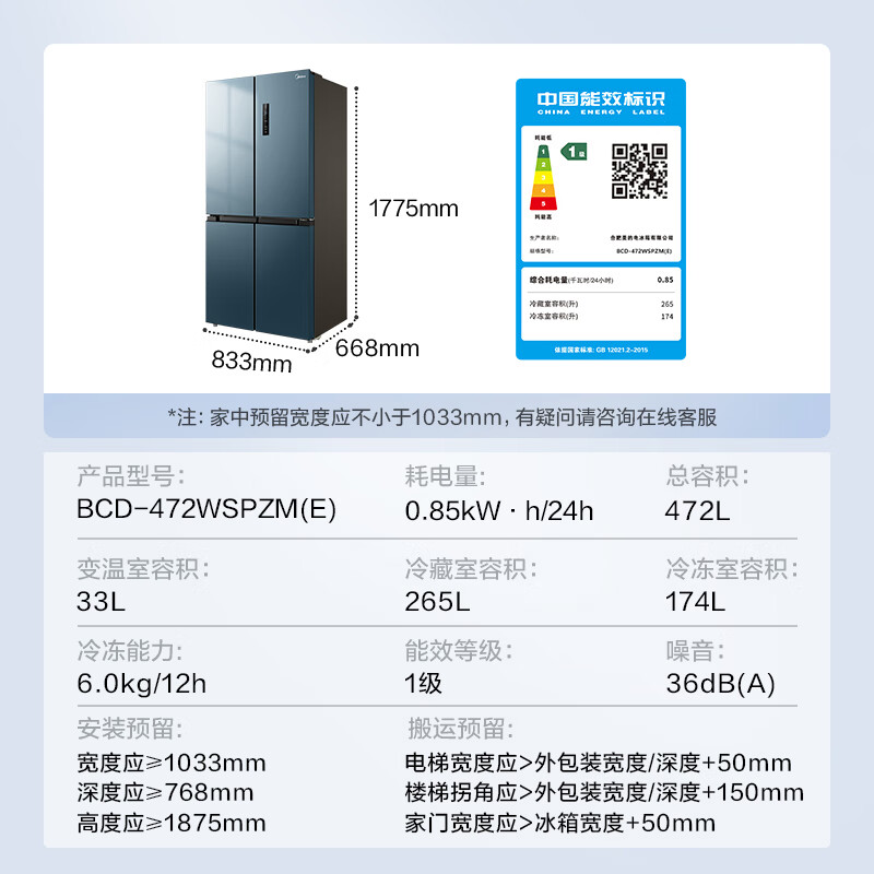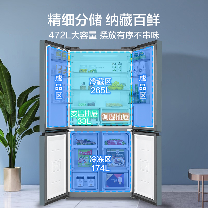 美的 果润精储系列 BCD-472WSPZM(E) 风冷十字对开门冰箱总容积为472L,冷藏室265L,冷冻室174L,变温室33L。采用变频风机+变频压缩机组合,综合耗电量为0.85kwh,符合一级能效标准,运行噪音仅有36dB,冷冻能力达到6kg/12h。全域温湿精控技术,精准控温同时,增加调温、调湿抽屉,实现食材精细化保鲜和分储。三挡变温模式和干湿自由调节,满足果蔬、干货和软冷冻的灵活需求。多个传感器精准感应冷藏室温度变化,温度波动小,保鲜时效长。内置铂金净味装置,有效吸附并分解异味,抗菌率高于99.9%。采用金属拉丝面板,半哑光质感,触感温润细腻,不易残留指纹。含门深宽高为648mm*833mm*1775mm。