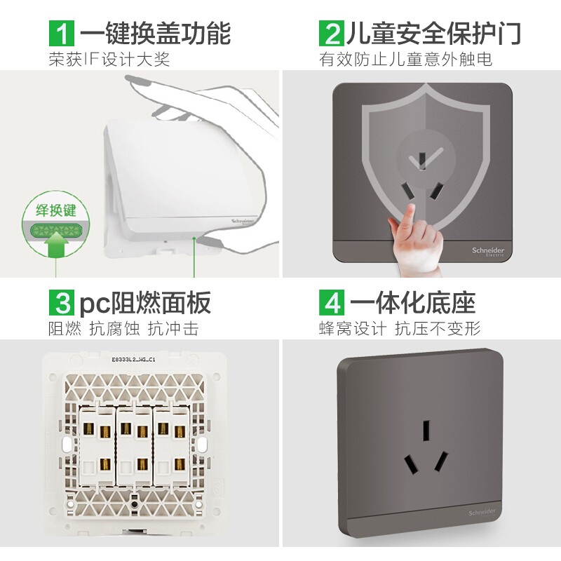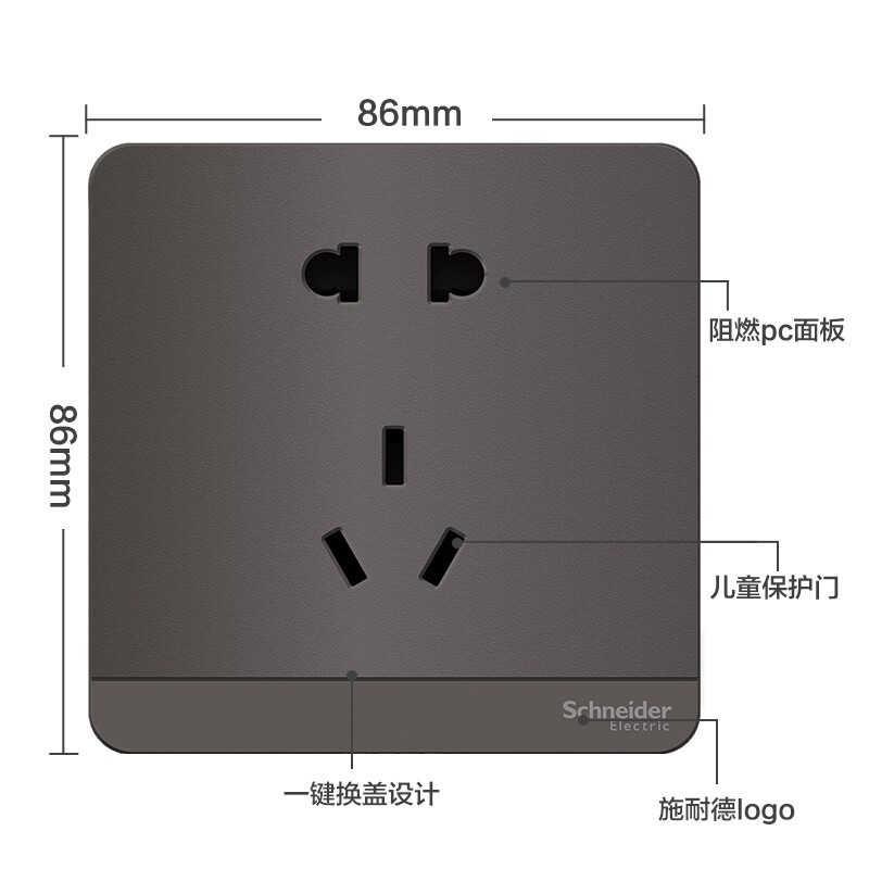 施耐德电气这款墙面插座,18.2mm大间距插孔设计,多设备插头同时使用互不干扰。内设安全防护门,避免手指或细小物体插入导致触电危险。壳体采用PC阻燃材料,耐高温,不易燃烧。一体化底座,抗压能力强,避免造成变形、破裂短路的情况发生。