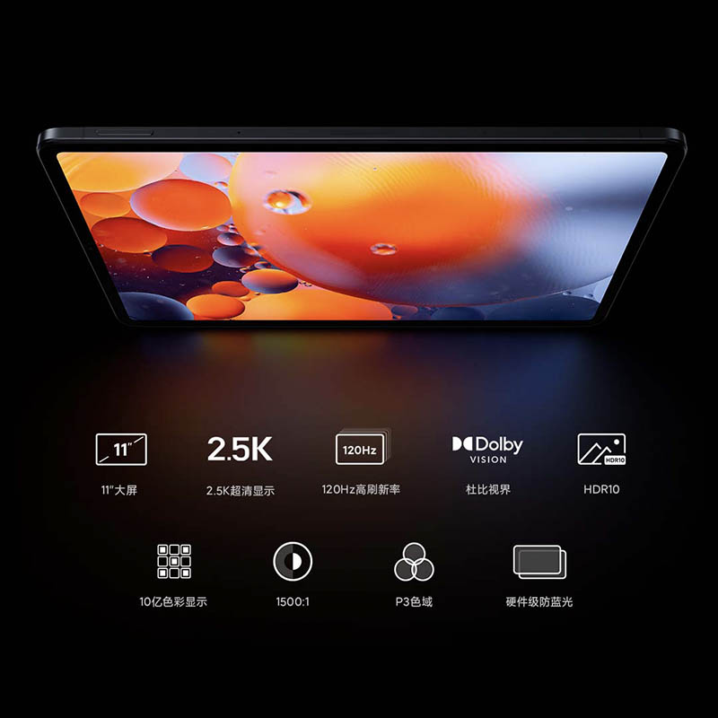 小米平板5全系标配一块11英寸2.5K超清屏幕,分辨率为2560*1600,支持10亿色、TrueTone真彩显示、HDR10、120Hz刷新率、杜比视界和硬件级防蓝光。机身厚度约6.85mm(Pro版6.86mm),重量511g